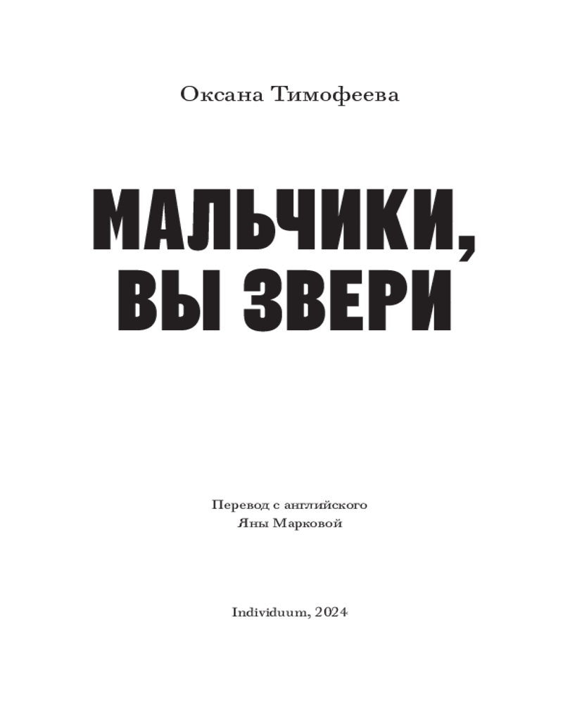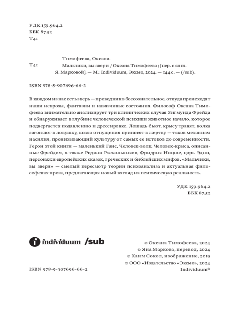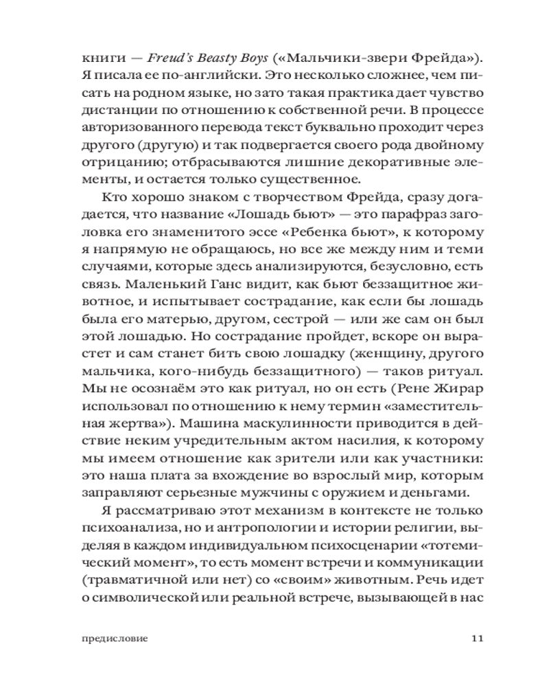 Серия: Individuum. Sub В каждом из нас есть зверь — проводник в бессознательное, откуда происходят наши неврозы, фантазии и навязчивые состояния. Философ Оксана Тимофеева внимательно анализирует три клинических случая Зигмунда Фрейда и обнаруживает в глубине человеческой психики животное начало, которое подвергается подавлению и дрессировке. Лошадь бьют, крысу травят, волка загоняют в ловушку, козла отпущения приносят в жертву — таков механизм насилия, пронизывающий культуру от самых ее истоков до современности. Герои этой книги — маленький Ганс, Человек-волк, Человек-крыса, описанные Фрейдом, а также Родион Раскольников, Фридрих Ницше, царь Эдип, персонажи европейских сказок, греческих и библейских мифов. «Мальчики, вы звери» — смелый пересмотр теории психоанализа и актуальная философская проза, предлагающая новый взгляд на психическую реальность. |