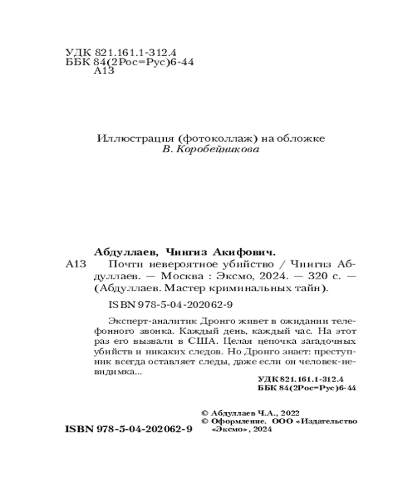 💳 Оплатить за товар можно при получении 🇰🇿 Есть бесплатная доставка по Казахстану от 1 дня 🎁 Копите бонусы с каждой покупки Серия: Абдуллаев. Мастер криминальных тайн (обложка) Эксперт-аналитик Дронго живет в ожидании телефонного звонка. Каждый день, каждый час. На этот раз его вызвали в США. Целая цепочка загадочных убийств и никаких следов. Но Дронго знает: преступник всегда оставляет следы, даже если он человек-невидимка... |