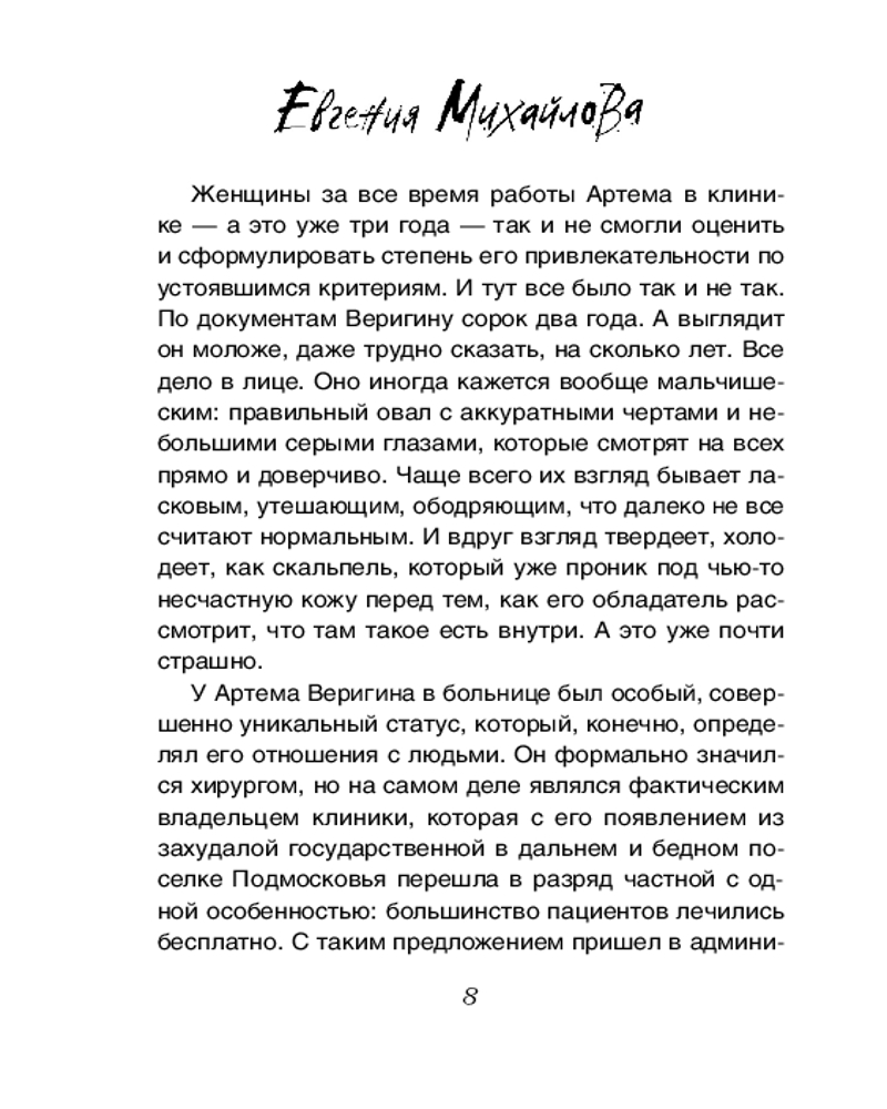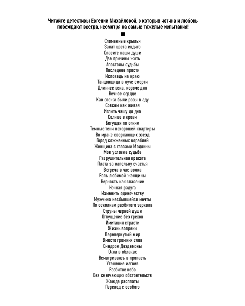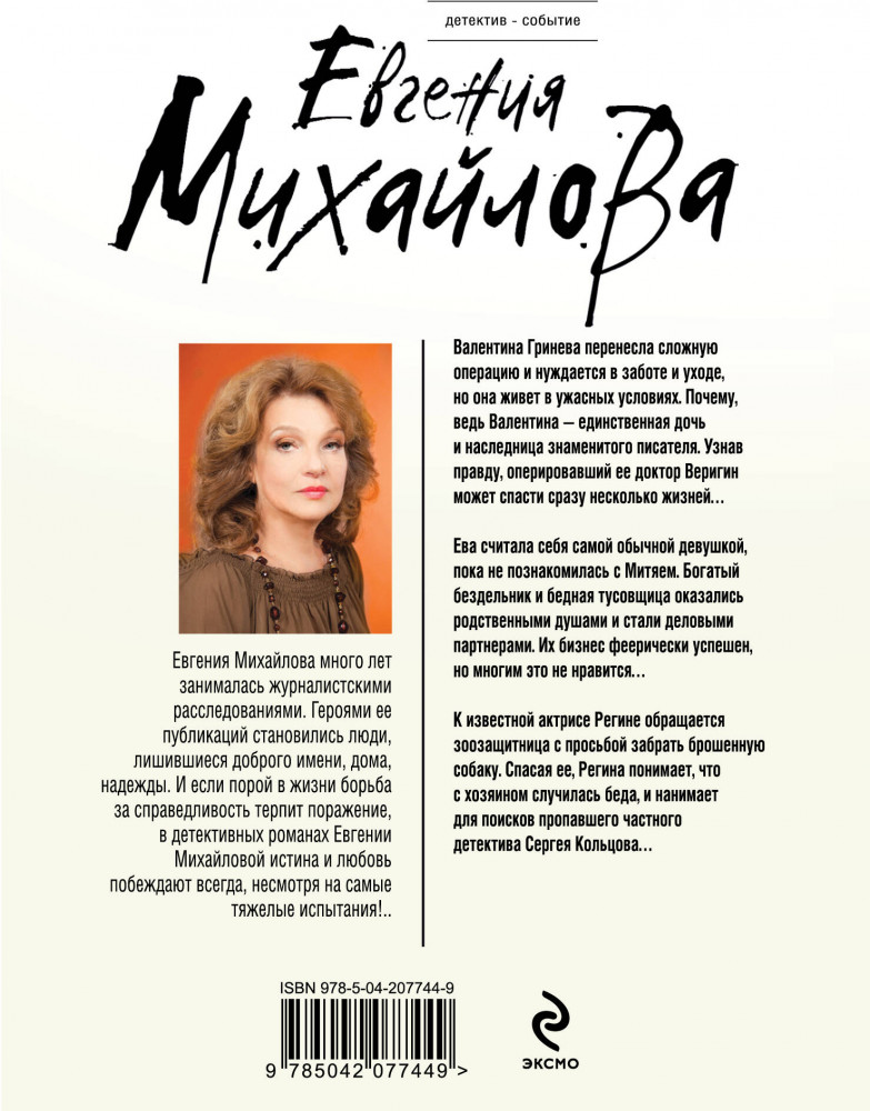 💳 Оплатить за товар можно при получении 🇰🇿 Есть бесплатная доставка по Казахстану от 1 дня 🎁 Копите бонусы с каждой покупки Серия: Детектив-событие (обложка) Валентина Гринева перенесла сложную операцию и нуждается в заботе и уходе, но она живет в ужасных условиях. Почему, ведь Валентина — единственная дочь и наследница знаменитого писателя. Узнав правду, оперировавший ее доктор Веригин может спасти сразу несколько жизней... Евы считала себя самой обычной девушкой, пока не познакомилась с Митяем. Богатый бездельник и бедная тусовщица оказались родственными душами и стали деловыми партнерами. Их бизнес феерически успешен, но многим это не нравится... К известной актрисе Регине обращается зоозащитница с просьбой забрать брошенную собаку. Спасая ее, Регина понимает, что с хозяином случилась беда, и нанимает для поисков пропавшего частного детектива Сергея Кольцова... |