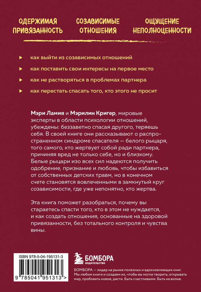 💳 Оплатить за товар можно при получении 🇰🇿 Есть бесплатная доставка по Казахстану от 1 дня 🎁 Копите бонусы с каждой покупки Серия: Карманный психолог. Готовые решения на все случаи жизни Мэри Ламия и Мэрилин Кригер, мировые эксперты в области психологии отношений, убеждены: беззаветно спасая другого — теряешь себя. В своей книге они рассказывают о распространенном синдроме спасателя — белого рыцаря, того самого, кто жертвует собой ради партнера, причиняя вред не только себе, но и близкому. Эта книга поможет разобраться, почему вы привлекаете к себе нуждающихся и несостоявшихся партнеров, которых приходится вести за собой, и как создать отношения, основанные на здоровой привязанности, без тотального контроля и чувства вины. Ранее книга выходила под названием «Синдром спасителя. Как исцелить отношения, в которых вы отдаете больше, чем получаете». |