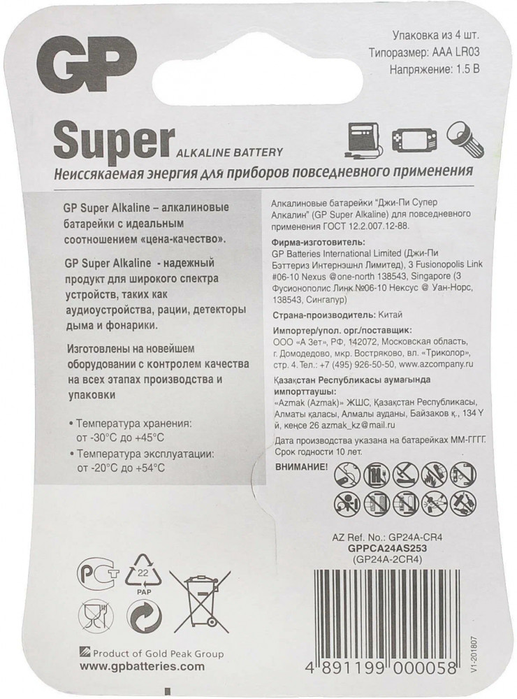 💳 Оплатить за товар можно при получении 🇰🇿 Есть бесплатная доставка по Казахстану от 1 дня 🎁 Копите бонусы с каждой покупки Серия: Super У батареек GP Super Alkaline, продолжительность работы в несколько раз выше, чем у солевых. Батарейки подходят для любых устройств повседневного использования, где требуется элемент питания типоразмера ААА. Например, для радиотелефонов, смарт-будильников, диктофонов, микрофонов, компьютерных мышек, дистанционных пультов управления, фонариков, настенных часов и других приборов. Надежная пленка защитит батарейки от нежелательных воздействий при транспортировке. Еще один плюс GP 24A-2CR4 – увеличенный срок хранения, который достигает 10 лет, тогда как у обычных батареек он составляет всего 1-3 года. |