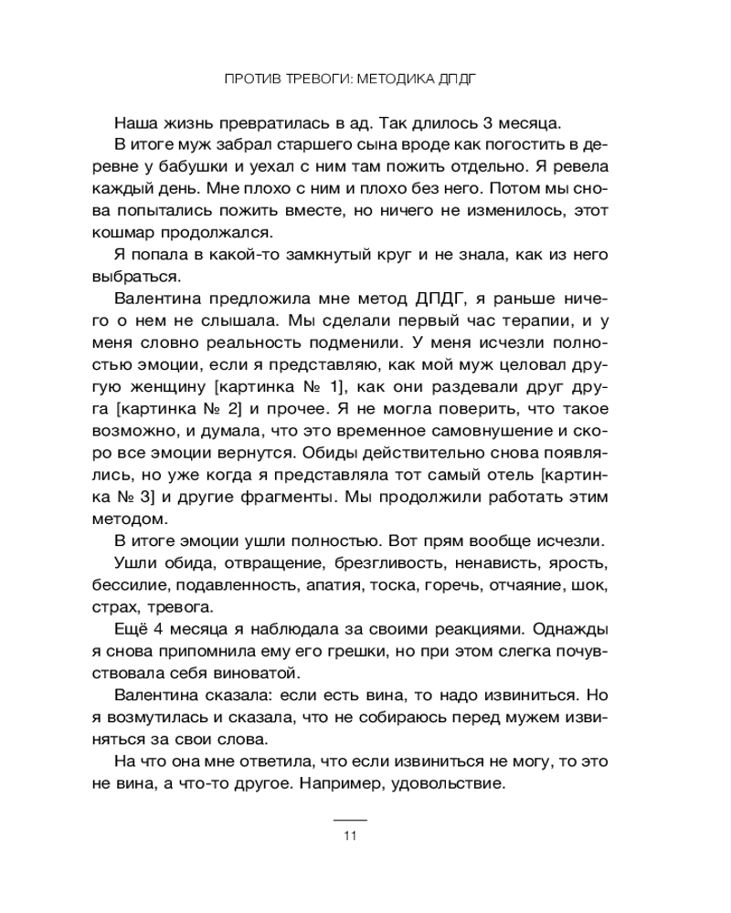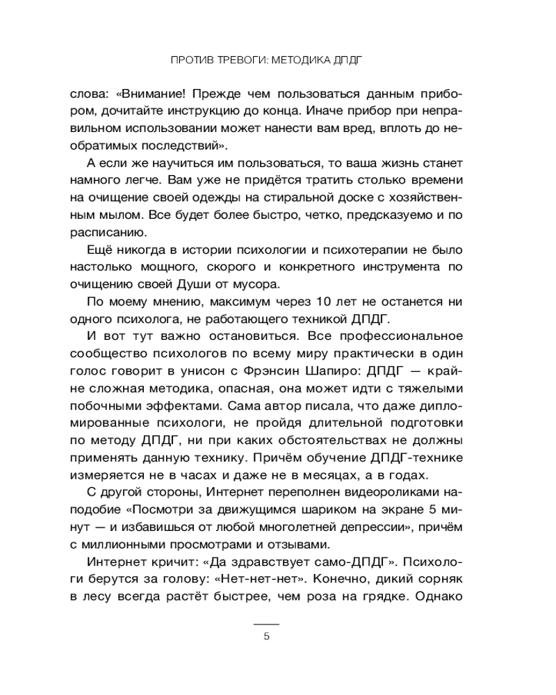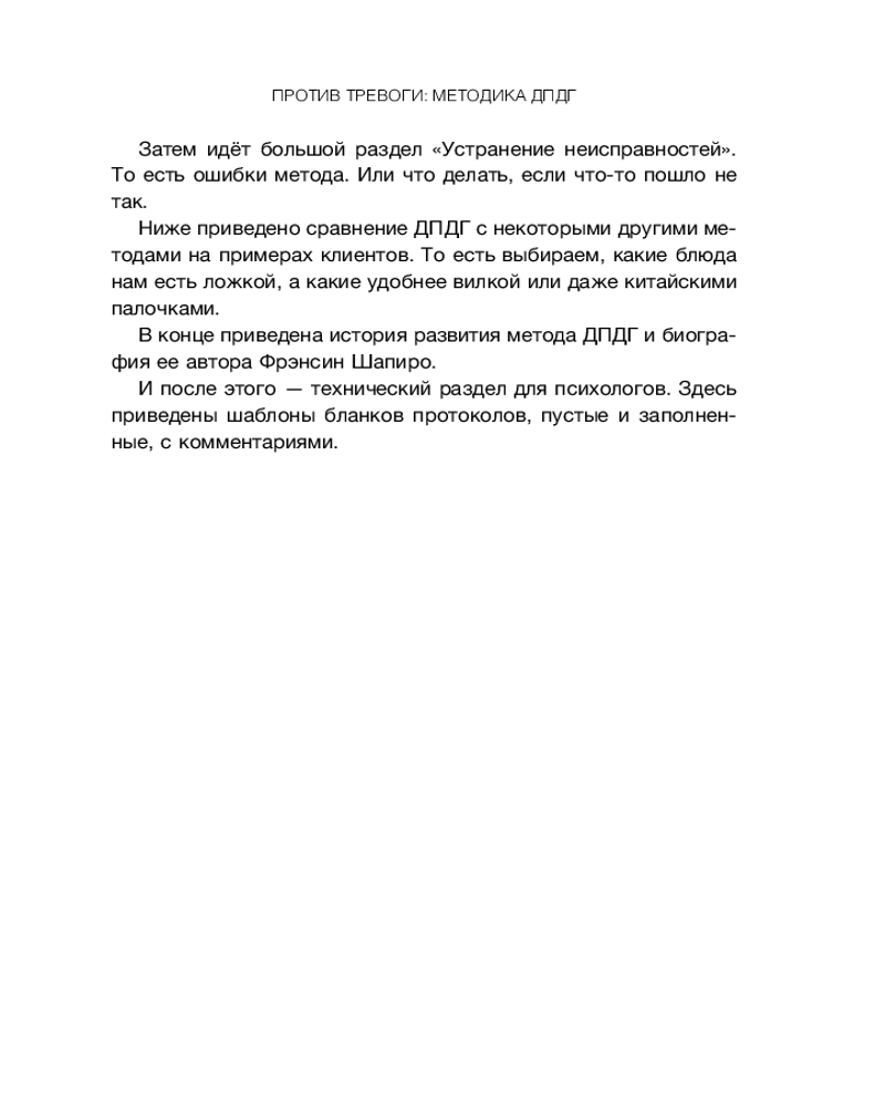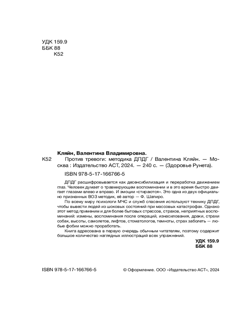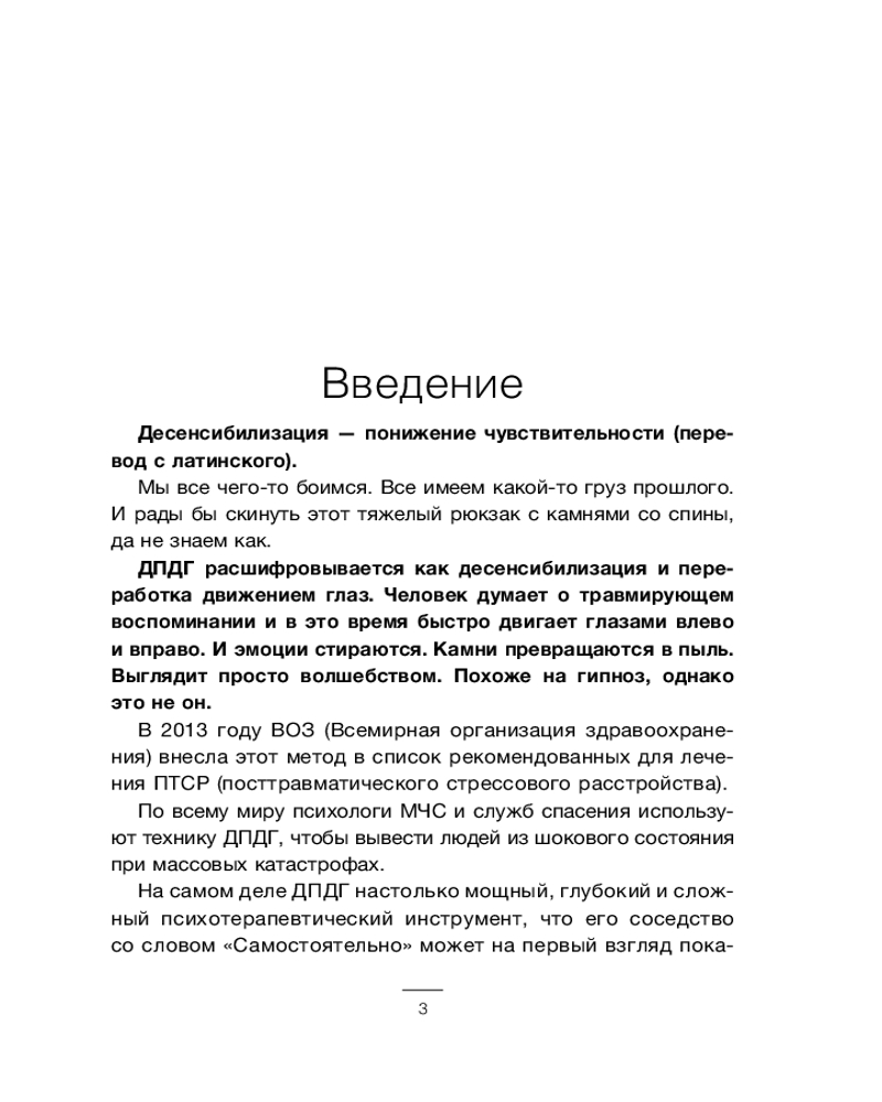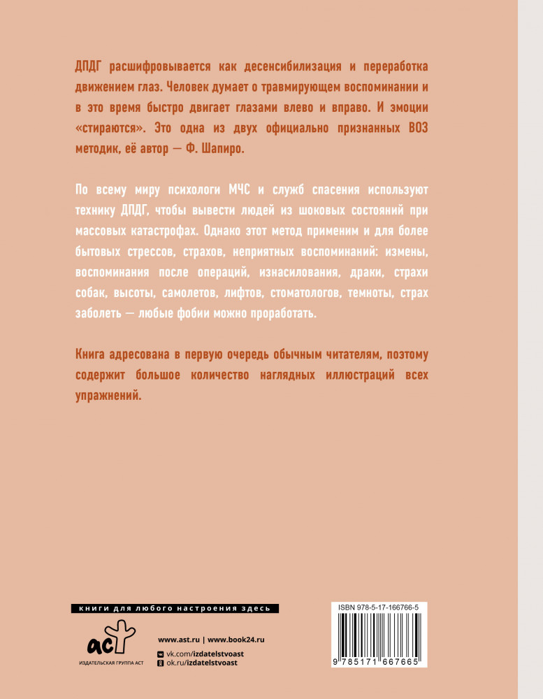 💳 Оплатить за товар можно при получении 🇰🇿 Есть бесплатная доставка по Казахстану от 1 дня 🎁 Копите бонусы с каждой покупки Серия: Здоровье Рунета ДПДГ расшифровывается как десенсибилизация и переработка движением глаз. Человек думает о травмирующем воспоминании и в это время быстро двигает глазами влево и вправо. И эмоции «стираются». Это одна из двух официально признанных ВОЗ методик, её автор — Ф. Шапиро. По всему миру психологи МЧС и служб спасения используют технику ДПДГ, чтобы вывести людей из шоковых состояний при массовых катастрофах. Однако этот метод применим и для более бытовых стрессов, страхов, неприятных воспоминаний: измены, воспоминания после операций, изнасилования, драки, страхи собак, высоты, самолетов, лифтов, стоматологов, темноты, страх заболеть — любые фобии можно проработать. Книга адресована в первую очередь обычным читателям, поэтому содержит большое количество наглядных иллюстраций всех упражнений. |