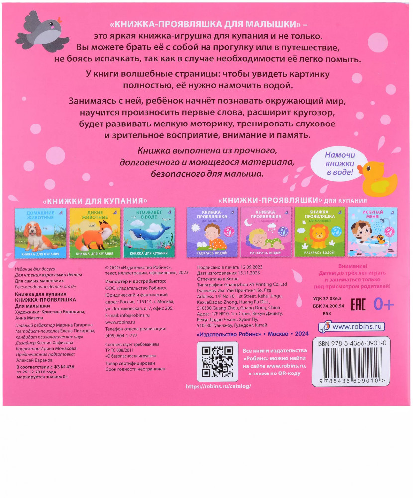 Серия: Книжка для купания «Книжка-проявляшка для малышки» — это яркая книжка-игрушка для купания и не только. Вы можете брать её с собой на прогулку или в путешествие, не боясь испачкать, так как в случае необходимости её легко помыть. У книги волшебные страницы: чтобы увидеть картинку полностью, её нужно намочить водой. |