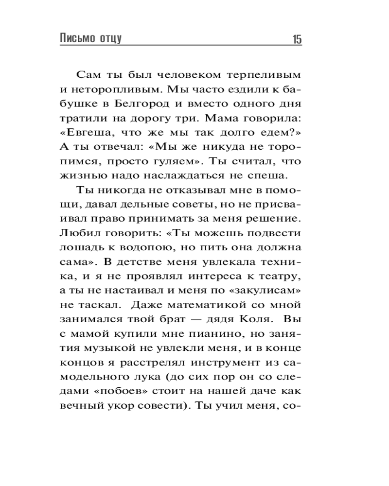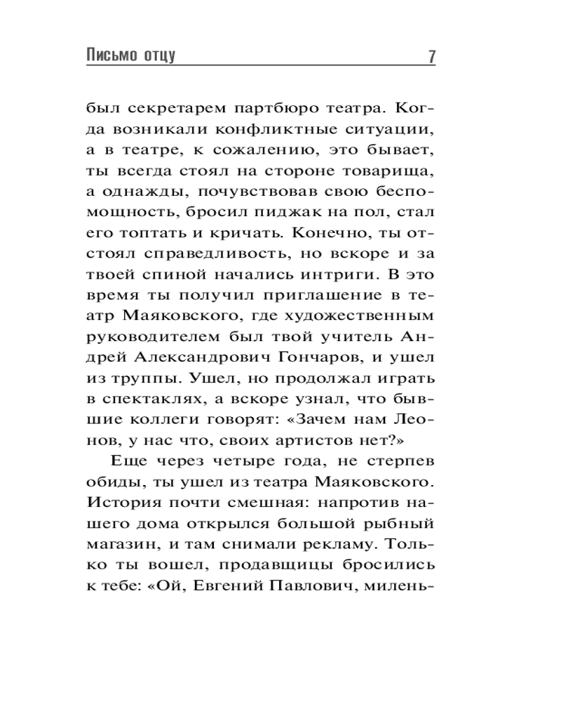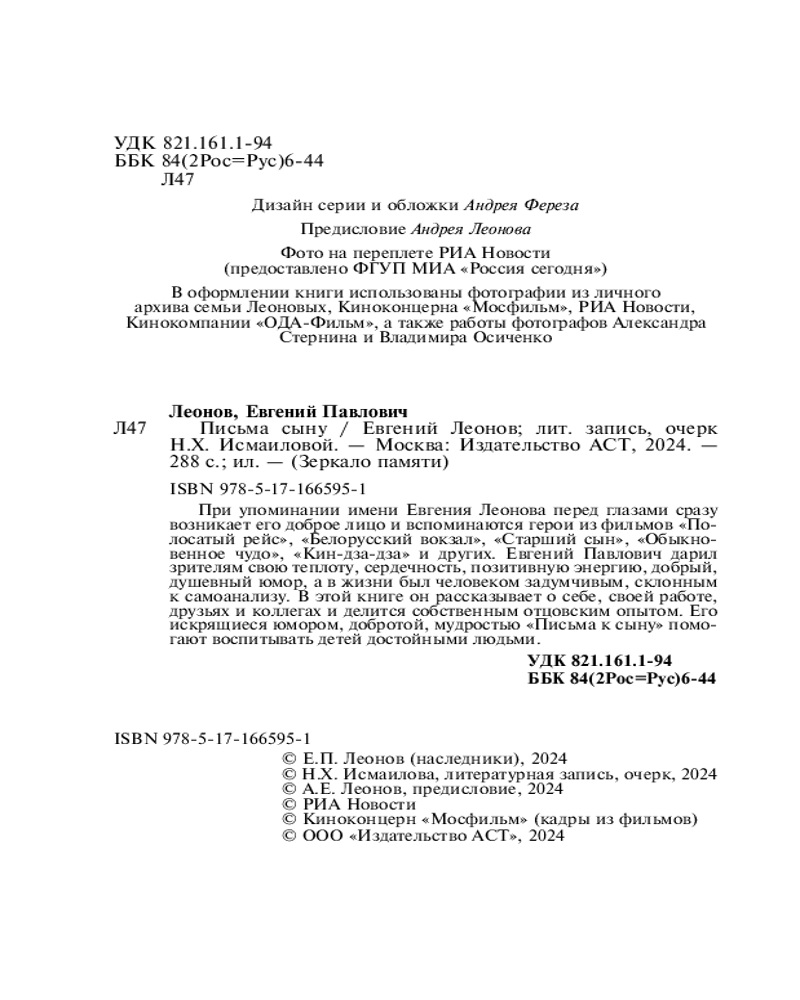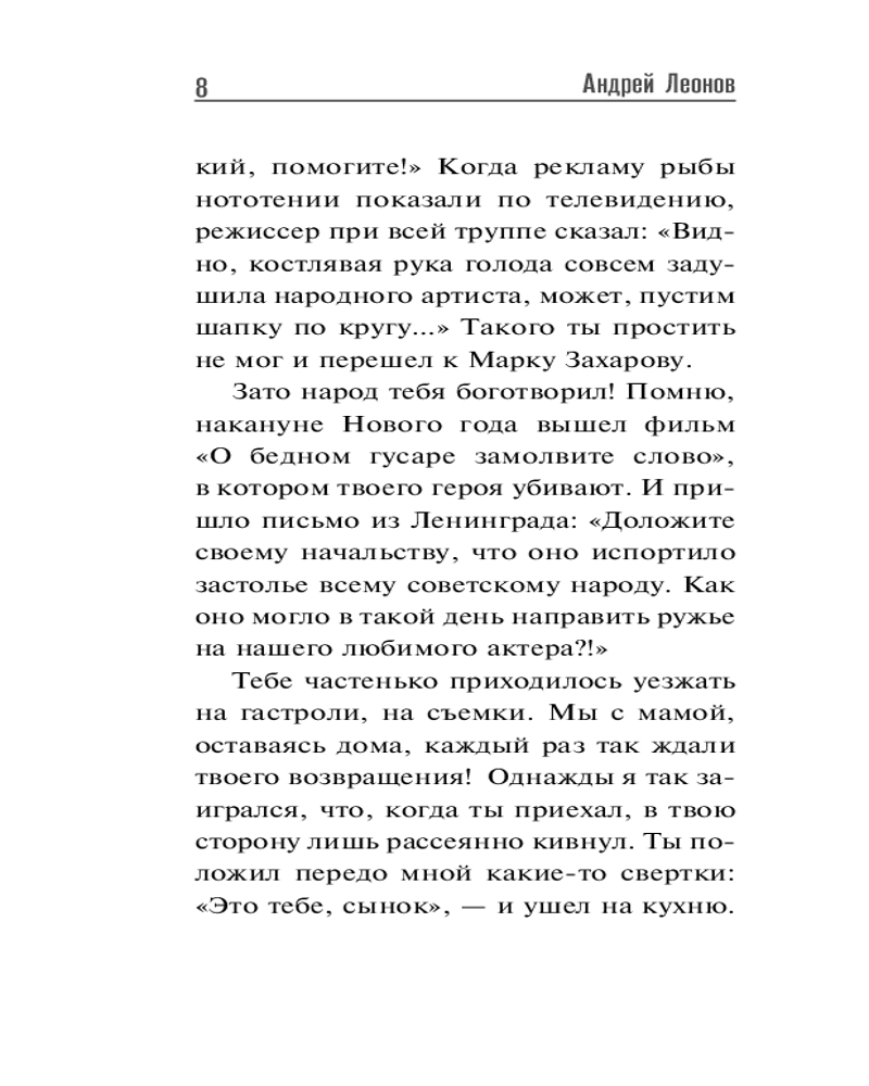 💳 Оплатить за товар можно при получении 🇰🇿 Есть бесплатная доставка по Казахстану от 1 дня 🎁 Копите бонусы с каждой покупки Серия: Зеркало памяти При упоминании имени Евгения Леонова перед глазами сразу возникает его доброе лицо и вспоминаются герои из фильмов «Полосатый рейс», «Белорусский вокзал», «Старший сын», «Обыкновенное чудо», «Кин-дза-дза» и других. Евгений Павлович дарил зрителям свою теплоту, сердечность, позитивную энергию, добрый, душевный юмор, а в жизни был человеком задумчивым, склонным к самоанализу. В этой книге он рассказывает о себе, своей работе, друзьях и коллегах и делится собственным отцовским опытом. Его искрящиеся юмором, добротой, мудростью «Письма к сыну» помогают воспитывать детей достойными людьми. |