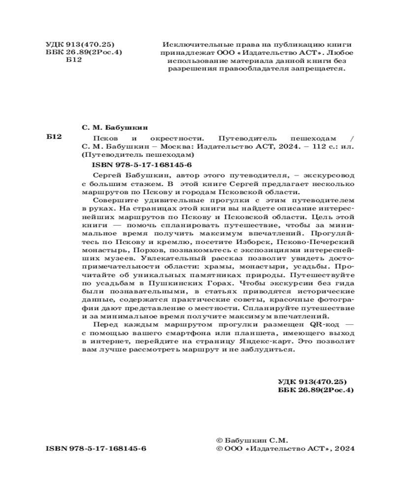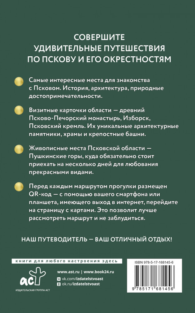 Серия: Путеводитель пешеходам Совершите удивительные прогулки с этим путеводителем в руках. На страницах этой книги вы найдете описание интереснейших маршрутов по Пскову и Псковской области. Цель этой книги — помочь спланировать путешествие, чтобы за минимальное время получить максимум впечатлений. Совершите прогулку по Пскову и кремлю, посетите Изборск, Псково-Печорский монастырь, Порхов, познакомьтесь с экспозициями интереснейших музеев. Увлекательный рассказ позволит увидеть достопримечательности области: храмы, монастыри, усадьбы. Прочитайте об уникальных памятниках природы. Совершите путешествие по усадьбам в Пушкинских Горах. Чтобы экскурсии без гида были познавательными, в статьях приводятся исторические данные, содержатся практические советы, красочные фотографии дают представление о местности. Спланируйте путешествие и за минимальное время получите максимум впечатлений. |
