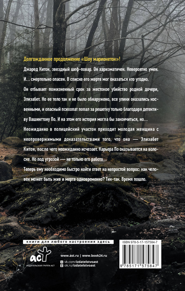 💳 Оплатить за товар можно при получении 🇰🇿 Есть бесплатная доставка по Казахстану от 1 дня 🎁 Копите бонусы с каждой покупки Серия: Новый мировой триллер Джаред Китон, звездный шеф-повар. Он харизматичен. Невероятно умен. И... смертельно опасен. В списке его жертв может оказаться кто угодно. Он отбывает пожизненный срок за жестокое убийство родной дочери, Элизабет. Но ее тело так и не было обнаружено, все улики оказались косвенными, и опасный психопат попал за решетку только благодаря детективу Вашингтону По. И на этом его история могла бы закончиться, но... Неожиданно в полицейский участок приходит молодая женщина с неопровержимыми доказательствами того, что она — Элизабет Китон, после чего неожиданно исчезает. Карьера По оказывается на волоске. Но под угрозой — не только его работа... Теперь ему необходимо быстро найти ответ на непростой вопрос: как человек может быть жив и мертв одновременно? Тик-так. Время пошло. |