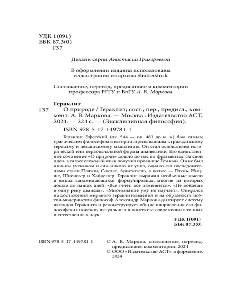 💳 Оплатить за товар можно при получении 🇰🇿 Есть бесплатная доставка по Казахстану от 1 дня 🎁 Копите бонусы с каждой покупки Серия: Эксклюзивная философия Гераклит Эфесский (ок. 544 — ок. 483 до н. э.) был самым трагическим философом в истории, призывавшим к гражданскому героизму и независимому мышлению. Он стал основателем исторической, или первоначальной, формы диалектики. Его единственное сочинение «О природе» дошло до нас во фрагментах. За свои идеи, а также сложный язык получил прозвище Темный. Он не был ничьим учеником и сам никого не учил, однако его последователями стали Платон, Сократ, Аристотель, а позже — Гегель, Ницше, Шпенглер и Хайдеггер. Гераклит выражал необычные мысли в емких запоминающихся формулировках, многие из которых дошли до наших дней: «Все течет, все изменяется», «Не войдешь в одну реку дважды», «Многознание уму не научает». Опираясь на достижения мирового гераклитоведения и на образность поэтов-модернистов, философ Александр Марков адаптирует систему взглядов Гераклита и реконструирует общие направления его философских поисков, актуальных в контексте современных точных и естественных наук. |