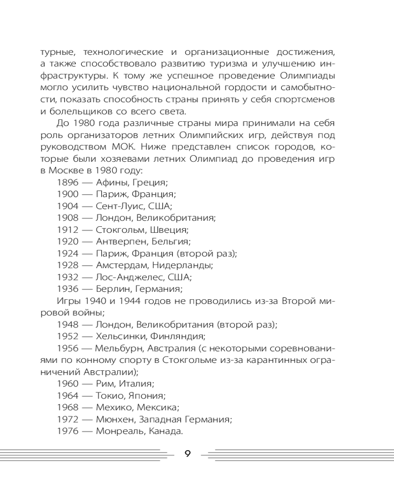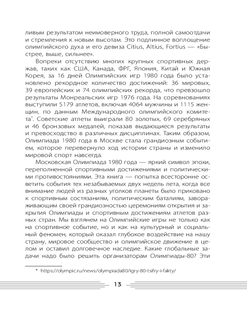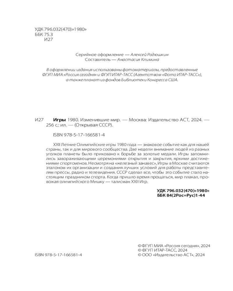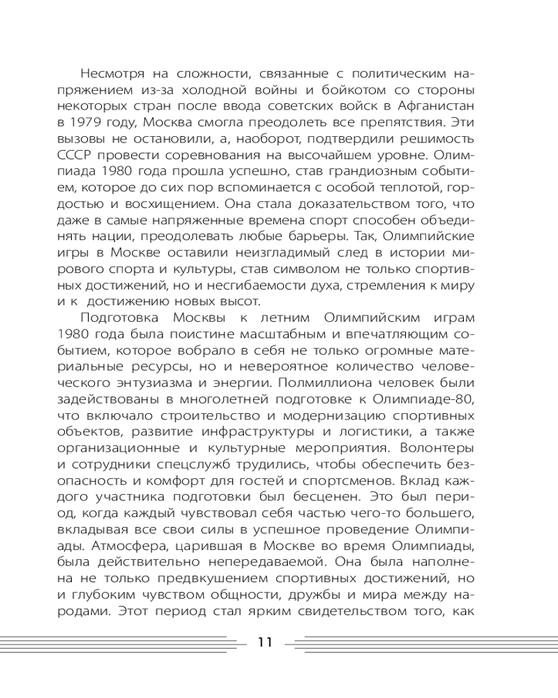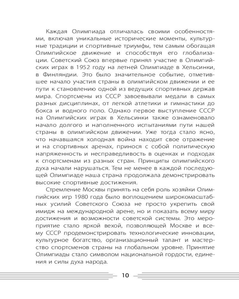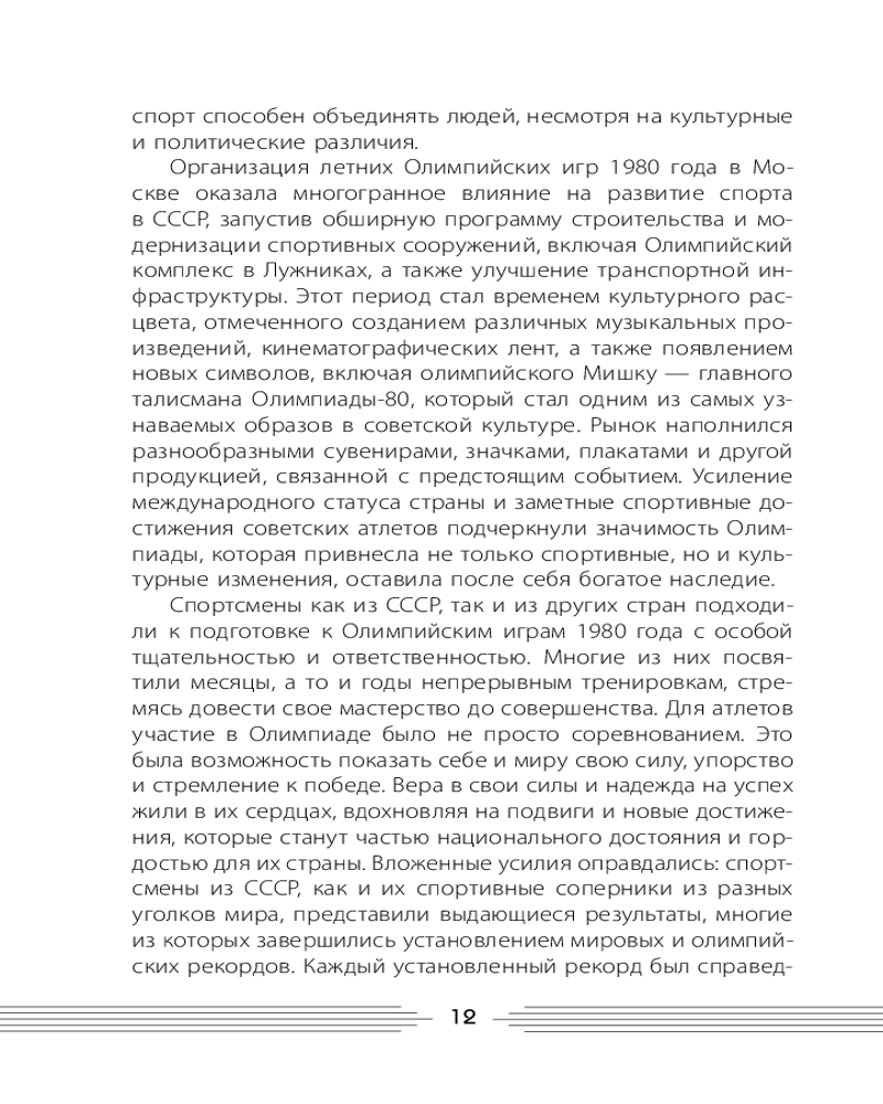 💳 Оплатить за товар можно при получении 🇰🇿 Есть бесплатная доставка по Казахстану от 1 дня 🎁 Копите бонусы с каждой покупки Серия: Открывая СССР XXII летние Олимпийские игры 1980 года — знаковое событие как для нашей страны, так и для мирового сообщества. Две недели внимание людей из разных уголков планеты было приковано к борьбе за золотые медали. Игры запомнились завораживающими церемониями открытия и закрытия, яркими достижениями спортсменов. Несмотря на «железный занавес», Игры в Москве считаются эталоном их организации и создания лучших условий для работы представителей прессы, радио и телевидения. СССР сделал всё, чтобы это событие стало настоящим праздником спорта. Когда пришло время прощаться, мир плакал, провожая олимпийского Мишку — талисман XXII Игр. Почему президент США призвал бойкотировать Игры 1980 года в Москве? Кто из спортсменов вошёл в Книгу рекордов Гиннесса? Какие задачи надо было решить организаторам? Ожесточённая борьба за медали, дружеские встречи в Олимпийской деревне, трогательные моменты на торжественных церемониях — всё это Игры в Москве. Чем ещё запомнились самые закрытые Игры, которые изменили мир? |