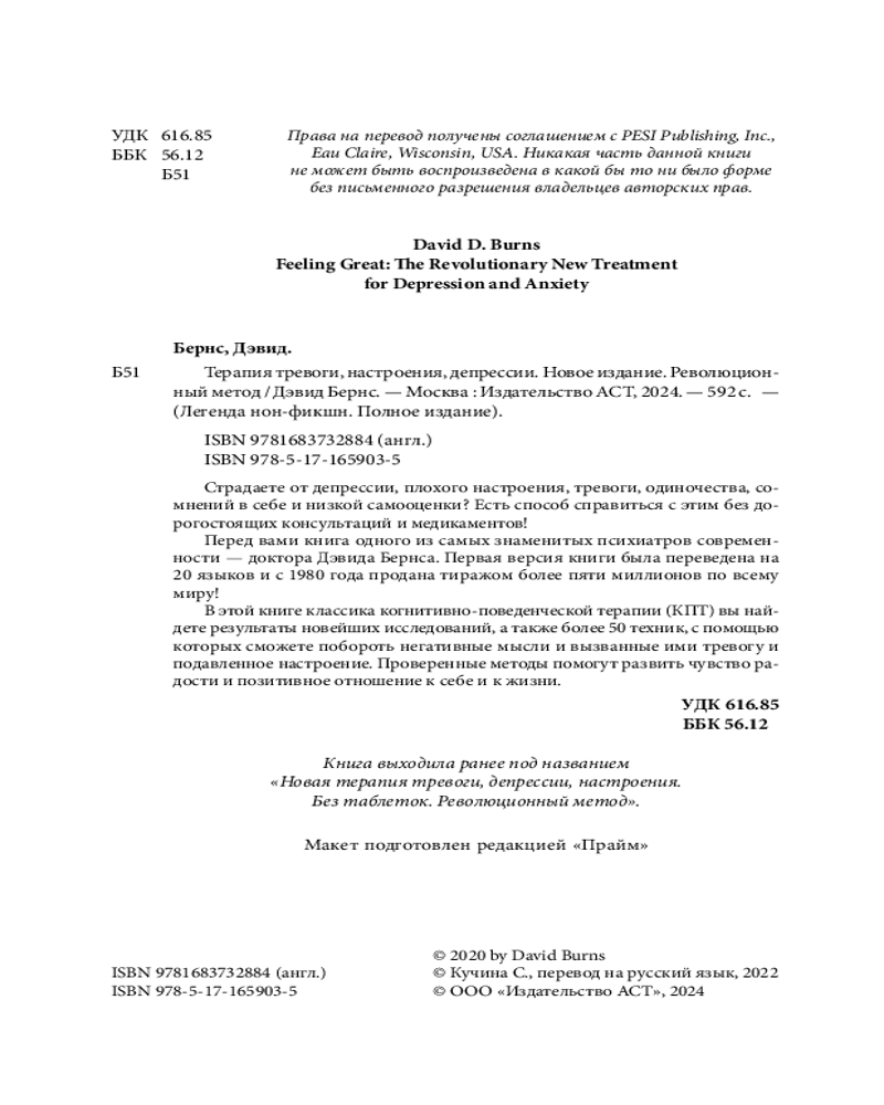 💳 Оплатить за товар можно при получении 🇰🇿 Есть бесплатная доставка по Казахстану от 1 дня 🎁 Копите бонусы с каждой покупки Доктор Дэвид Бернс — американский психиатр, заслуженный ученый, преподаватель, автор мировых бестселлеров, популяризатор когнитивно-поведенческой терапии. Перед вами самое последнее, дополненное издание классической работы Дэвида Бернса, основанное на новейших исследованиях в области психологии. В книге более 50 техник, с помощью которых вы сможете побороть негативные мысли и вызванные ими тревогу и подавленное настроение. Новые методы помогут развить чувство радости и позитивное отношение к себе и к жизни. |