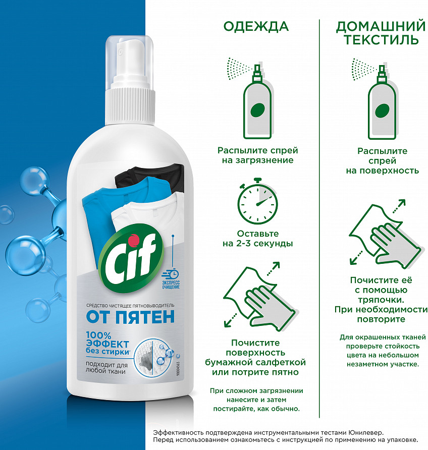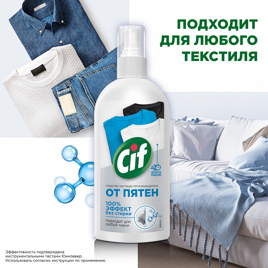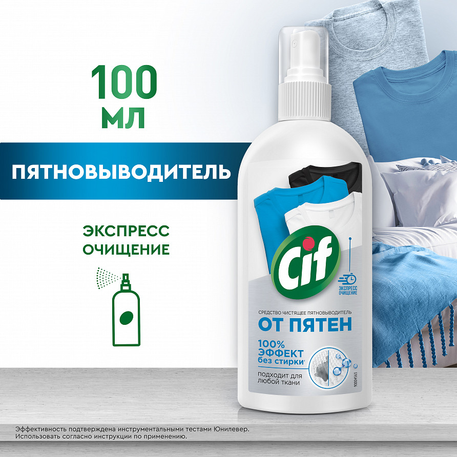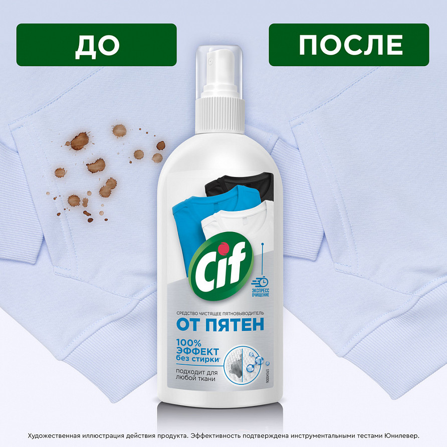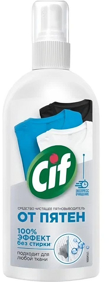Пятновыводитель Cif — это чистящее средство — новинка, которое удаляет до 20 видов пятен и обеспечивает 100% мгновенный эффект без стирки. Универсальный спрей от пятен подходит для удаления загрязнений с белой, черной и цветной одежды и домашнего текстиля. Универсальный чистящий спрей подходит для любой ткани. Пятновыводитель Cif можно применять для удаления загрязнений с одежды и домашнего текстиля. Спрей от пятен на одежде подойдет для удаления загрязнений с обивки мебели, ковров, цветного белья. Средство от пятен на одежде действует не хуже, чем кислородный отбеливатель, порошок, антипятин или мыло. Спрей для удаления пятен с одежды обеспечивает 100% очищающий эффект без стирки. Пятновыводитель Cif — лучшее средство для того, чтобы быстро и эффективно удалить загрязнения. Бытовая химия для дома от бренда Cif — это деликатные моющие средства с эффективной формулой, которым доверяют потребители.