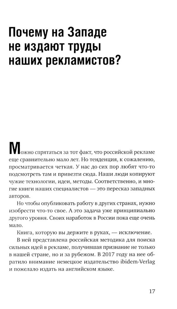 💳 Оплатить за товар можно при получении 🇰🇿 Есть бесплатная доставка по Казахстану от 1 дня 🎁 Копите бонусы с каждой покупки Идеи — твердая валюта рекламной индустрии. Каждый день креативные агентства занимаются тем, что придумывают множество концепций для заказчиков. На практике основным способом поиска новых идей остается крайне неэффективный метод проб и ошибок. В книге предлагается альтернативный подход к поиску нестандартных идей в рекламе. Возможно, впервые в рекламном деле подробно рассмотрены, проанализированы и приведены в систему креативные приемы, позволяющие выходить на сильное решение без перебора вариантов. Одновременно обсуждаются и психологические барьеры, которые мешают находить неожиданные рекламные ходы. |