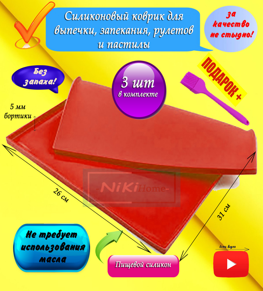 Коврик из силикона для запекания имеет множество преимуществ по сравнению с обычными противнями для выпечки. Во-первых, он не прилипает к продуктам, благодаря чему выпечка легко отделяется от поверхности коврика. Во-вторых, коврик можно использовать многократно, не боясь, что он повредится или изнашивается. Данный коврик для выпечки может использоваться для приготовления различных блюд, таких как бисквиты, кексы и пироги, суши, а также коврик может использоваться для сушки посуды, как подставка под горячее или заморозки продуктов в морозильной камере. Отличный подарок на день рождения. |