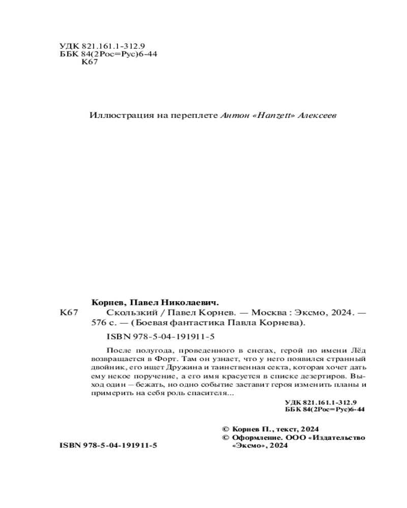 💳 Оплатить за товар можно при получении 🇰🇿 Есть бесплатная доставка по Казахстану от 1 дня 🎁 Копите бонусы с каждой покупки Серия: Боевая фантастика Павла Корнева После полугода, проведенного в снегах, герой по имени Лёд возвращается в Форт. Там он узнаёт, что у него появился странный двойник, его ищет Дружина и таинственная секта, которая хочет дать ему некое поручение, а его имя красуется в списке дезертиров. Выход один — бежать, но одно событие заставит героя изменить планы и примерить на себя роль спасителя... |