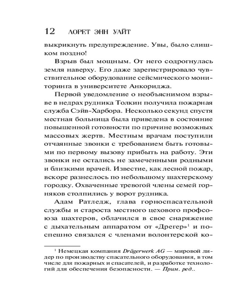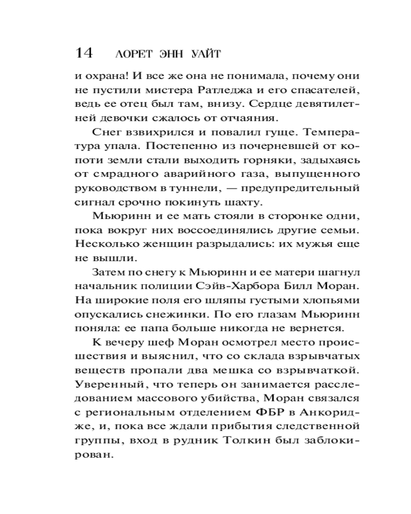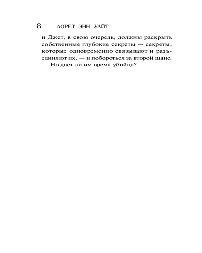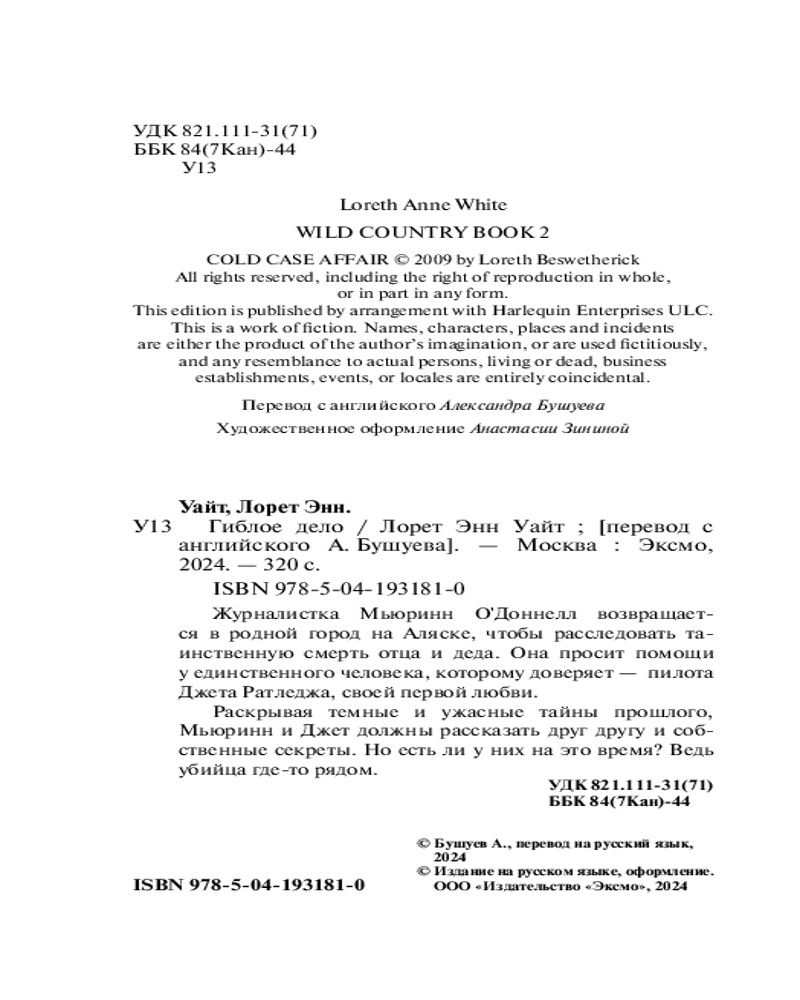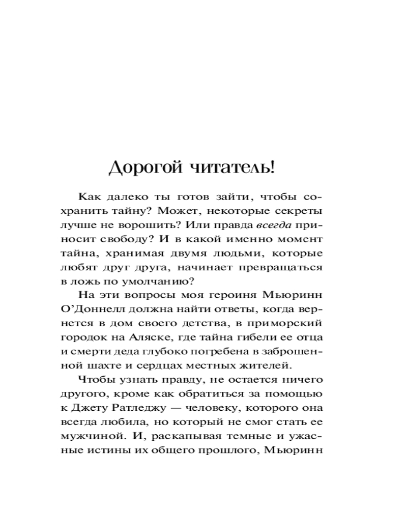 💳 Оплатить за товар можно при получении 🇰🇿 Есть бесплатная доставка по Казахстану от 1 дня 🎁 Копите бонусы с каждой покупки Серия: Высшая лига детектива. Романы Лорет Энн Уайт Журналистка Мьюринн О’Доннелл возвращается в родной город на Аляске, чтобы расследовать таинственную смерть отца и деда. Она просит помощи у единственного человека, которому доверяет, — пилота Джета Ратледжа, своей первой любви. Раскрывая темные и ужасные тайны прошлого, Мьюринн и Джет должны рассказать друг другу и собственные секреты. Но есть ли у них на это время? Ведь убийца где-то рядом. Лорет Энн Уайт — трижды финалист RITA, самой значимой премии за вклад в детективно-романтическую прозу. |