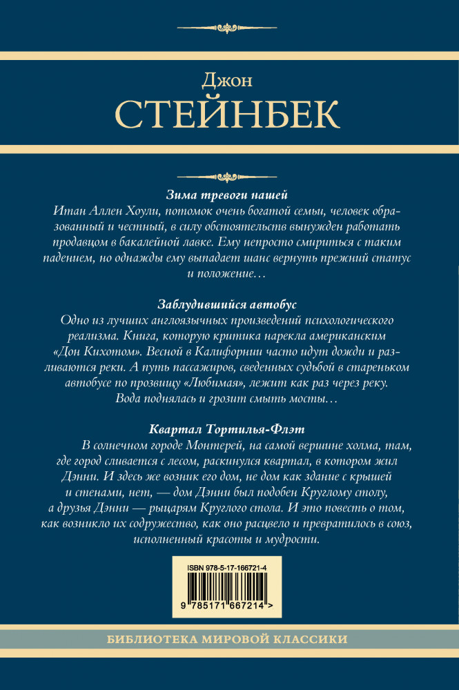 💳 Оплатить за товар можно при получении 🇰🇿 Есть бесплатная доставка по Казахстану от 1 дня 🎁 Копите бонусы с каждой покупки Серия: Neoclassic (Лучшее) Джон Стейнбек (1902–1968) — американский писатель, лауреат Нобелевской и Пулитцеровской премий, автор всемирно известных романов «Гроздья гнева» и «К востоку от Эдема». Произведения Стейнбека пользуются заслуженной славой у читателей и неизменно привлекают внимание кинематографистов — большая часть его романов получила экранное воплощение. В сборник включены романы, представляющие разные периоды творчества писателя: «Зима тревоги нашей», «Заблудившийся автобус» и «Квартал Тортилья-Флэт». |
