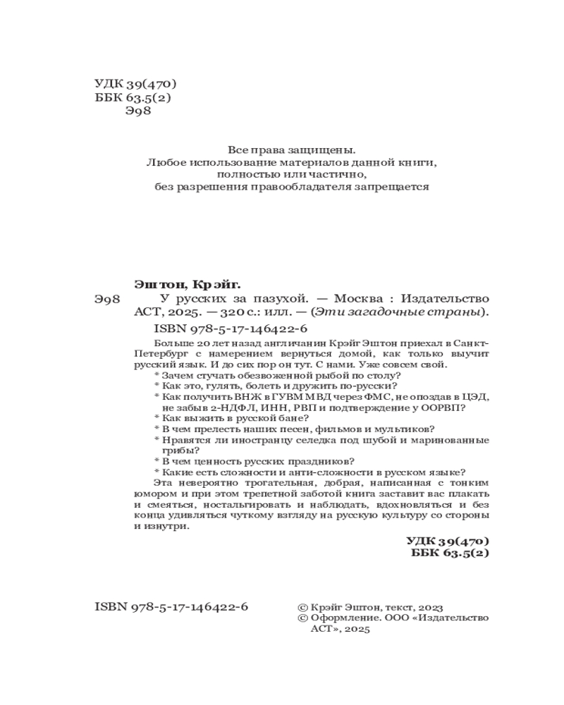 💳 Оплатить за товар можно при получении 🇰🇿 Есть бесплатная доставка по Казахстану от 1 дня 🎁 Копите бонусы с каждой покупки Серия: Эти загадочные страны Больше 20 лет назад англичанин Крэйг Эштон приехал в Санкт-Петербург с намерением вернуться домой, как только выучит русский язык. И до сих пор он тут. С нами. Уже совсем свой. Эта невероятно трогательная, добрая, написанная с тонким юмором и при этом трепетной заботой книга заставит вас плакать и смеяться, ностальгировать и наблюдать, вдохновляться и без конца удивляться чуткому взгляду на русскую культуру со стороны и изнутри. |