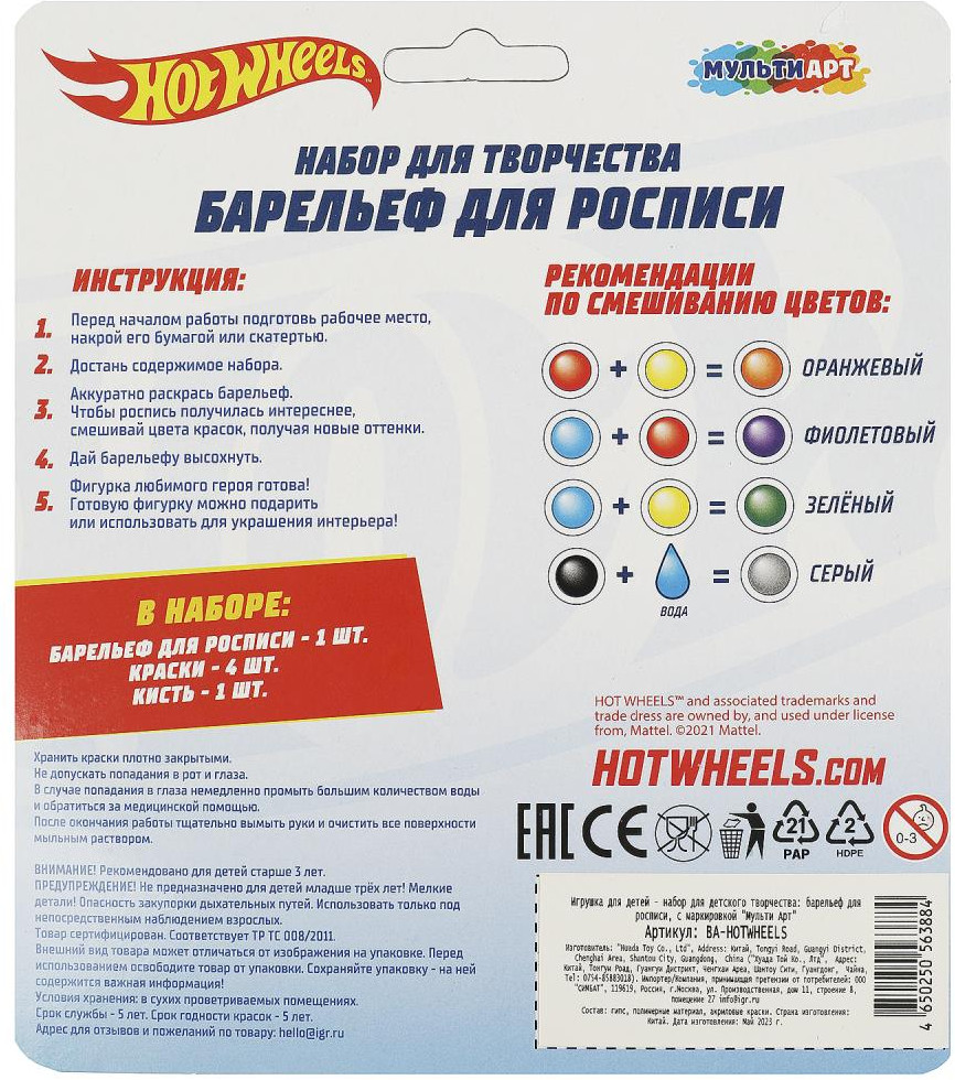 💳 Оплатить за товар можно при получении 🇰🇿 Есть бесплатная доставка по Казахстану от 1 дня 🎁 Копите бонусы с каждой покупки Набор для творчества — барельеф для росписи «Hot Wheels» ТМ «Мульти Арт» непременно понравится маленьким поклонникам легендарных гоночных машинок. |
