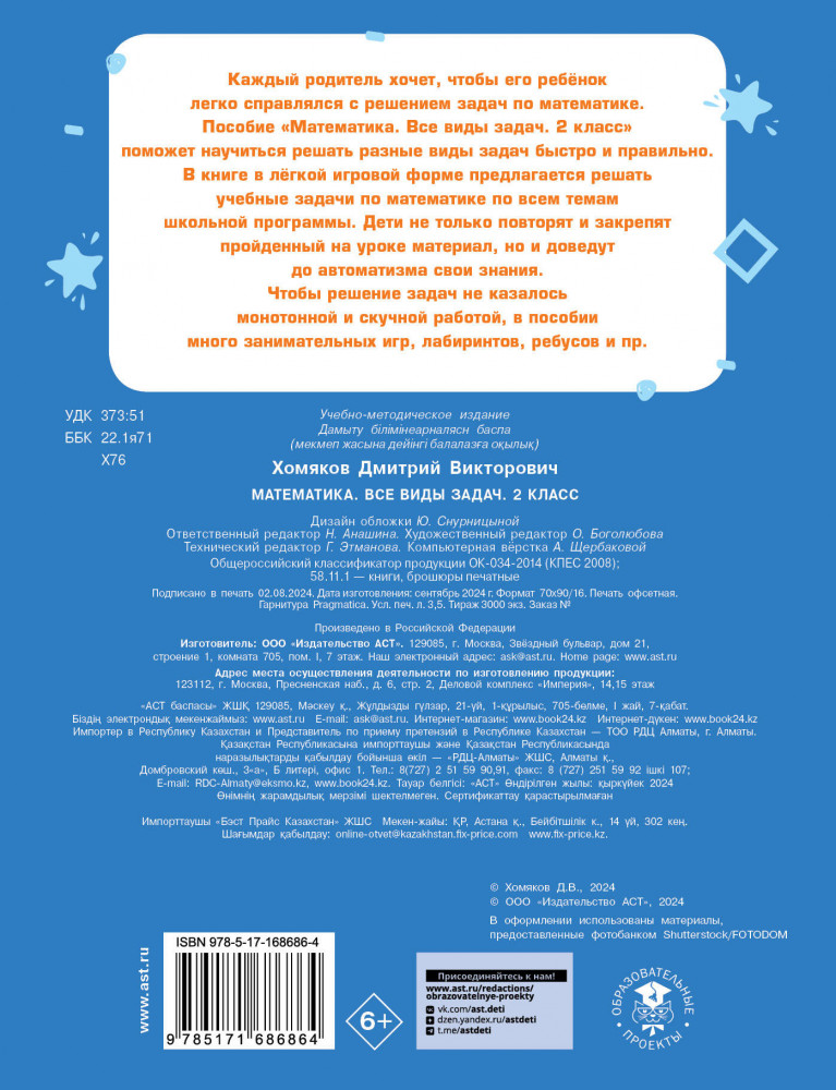💳 Оплатить за товар можно при получении 🇰🇿 Есть бесплатная доставка по Казахстану от 1 дня 🎁 Копите бонусы с каждой покупки Серия: Тренажерный класс Каждый родитель хочет, чтобы его ребёнок легко справлялся с решением задач по математике. Пособие «Математика. Все виды задач. 2 класс» поможет научиться решать разные виды задач быстро и правильно. В книге в лёгкой игровой форме предлагается решать учебные задачи по математике по всем темам школьной программы. Дети не только повторят и закрепят пройденный на уроке материал, но и доведут до автоматизма свои знания. Чтобы решение задач не казалось монотонной и скучной работой, в пособии много занимательных игр, лабиринтов и ребусов. |