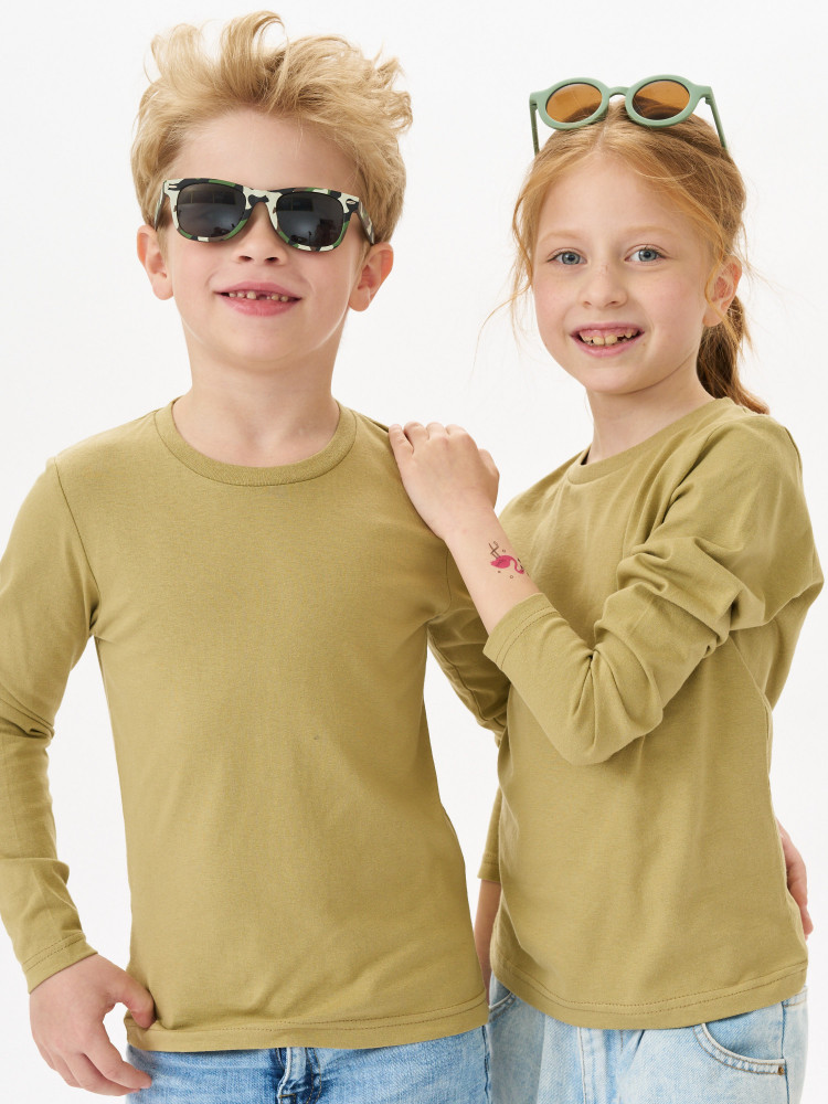 Лонгслив детский прямого покроя с втачным длинным рукавом. По линии горловины втачен ворот из ластичного полотна с 5% добавлением лайкры. Перед и спинка цельнокроеная. Плечевые швы обтачены бейкой из основного полотна, в край проложена отделочная строчка. Низ и рукава подогнуты и подшиты на распошивальной машине. Состав — 100% органический длинноволокнистый хлопок. Ткань — кулирная гладь, из гребенной пряжи Ne 24/1, активное глубокое крашение.