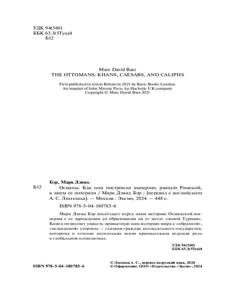 💳 Оплатить за товар можно при получении 🇰🇿 Есть бесплатная доставка по Казахстану 🎁 Копите бонусы с каждой покупки Серия: Перекресток цивилизаций. Путешествие в истории древних народов Марк Дэвид Бэр воссоздает перед нами историю Османской империи с ее зарождения до образования на ее месте «новой Турции». Книга позволяет увидеть привычную нам историю мира с «обратной», «незападной» стороны — глазами граждан колоссального государства, которому в течение нескольких веков принадлежала ведущая роль в глобальной геополитике. |
