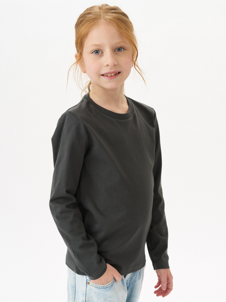 Лонгслив детский прямого покроя с втачным длинным рукавом. По линии горловины втачен ворот из ластичного полотна с 5% добавлением лайкры. Перед и спинка цельнокроеная. Плечевые швы обтачены бейкой из основного полотна, в край проложена отделочная строчка. Низ и рукава подогнуты и подшиты на распошивальной машине. Состав — 100% органический длинноволокнистый хлопок. Ткань — кулирная гладь, из гребенной пряжи Ne 24/1, активное глубокое крашение.