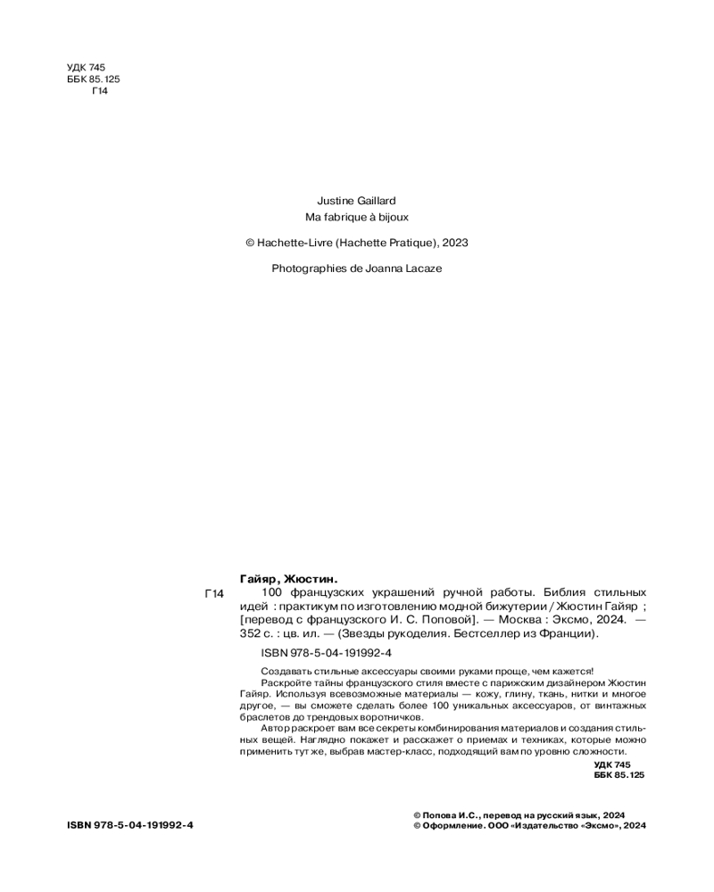 💳 Оплатить за товар можно при получении 🇰🇿 Есть бесплатная доставка по Казахстану от 1 дня 🎁 Копите бонусы с каждой покупки Серия: Звезды рукоделия. Бестселлер из Франции Создавать стильные аксессуары своими руками проще чем кажется! Раскройте тайны французского стиля вместе с парижским дизайнером Жюстин Гайяр. Используя всевозможные материалы — кожу, глину, ткань, нитки и многое другое, вы сможете сделать более 100 уникальных аксессуаров, от винтажных браслетов до трендовых воротничков. Автор раскроет вам все секреты комбинрования материалов и создания стильных вещей. Наглядно покажет и расскажет о приемах и техниках, которые можно применить тут же, выбрав мастер-класс подходящий вам по уровню сложности. |
