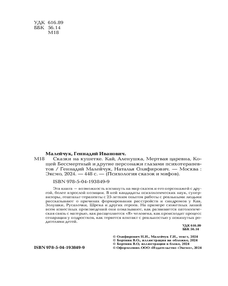 💳 Оплатить за товар можно при получении 🇰🇿 Есть бесплатная доставка по Казахстану от 1 дня 🎁 Копите бонусы с каждой покупки Серия: Психология сказок и мифов Эта книга — возможность взглянуть на мир сказок и его персонажей с другой, более взрослой позиции. В ней кандидаты психологических наук, супервизоры, гештальт-терапевты с 25-летним опытом работы с реальными людьми, рассказывают о причинах формирования расстройств и синдромов у Кая, Золушки, Русалочки, Шрека и других героев. На примере сюжетных линий всем известных произведений они показывают, как развивается патологическая связь с матерью, как расщепляется «Я» человека, как происходит процесс сепарации у подростков, как теряется контакт с реальностью у покинутых родителями детей. |