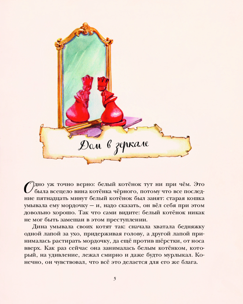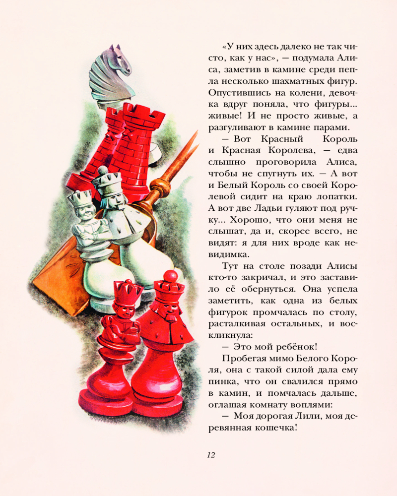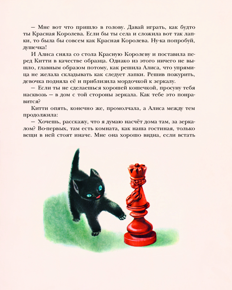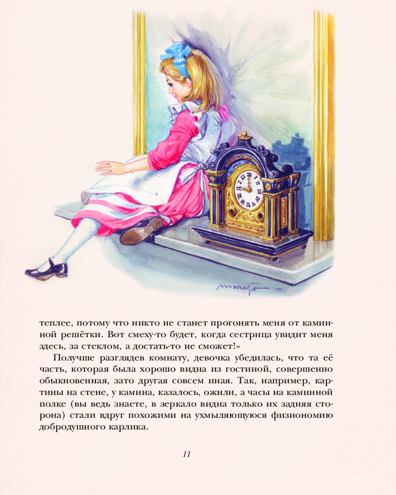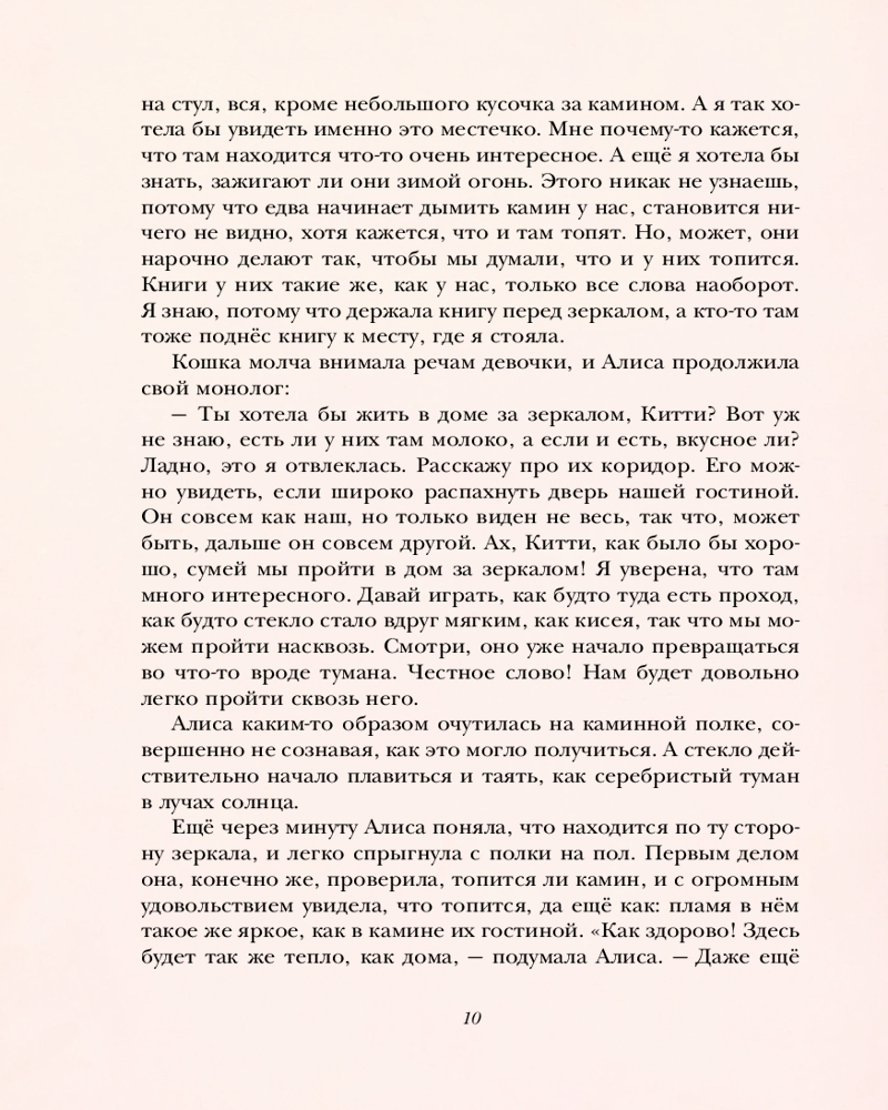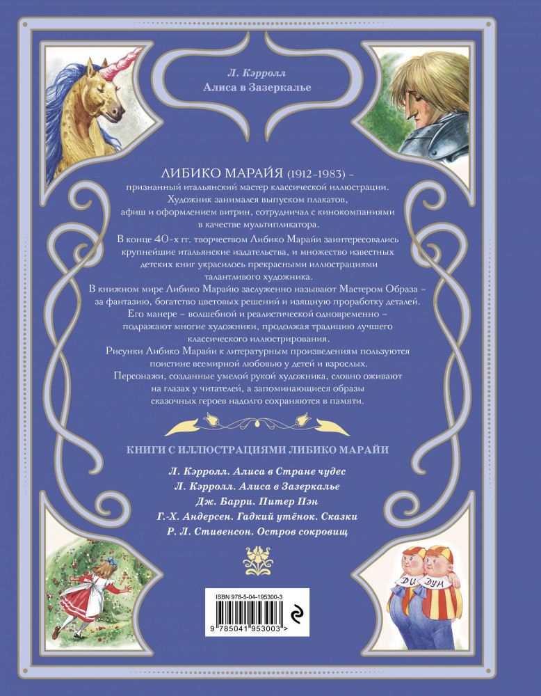 Серия: Искусство иллюстрации. Коллекция утончённых книг Неунывающая Алиса вновь попадает в волшебную страну — на этот раз в Зазеркалье. Здесь всё до странности наоборот: чтобы остаться на месте, нужно очень быстро бежать, зазеркальный пирог нужно сначала раздать гостям, а после порезать, а жители этой страны помнят только то, что произойдёт в будущем. Ещё Алисе предстоит сыграть с героями шахматную партию и стать королевой. Путешествие по необычной стране, логические загадки, несуразицы и философские размышления |