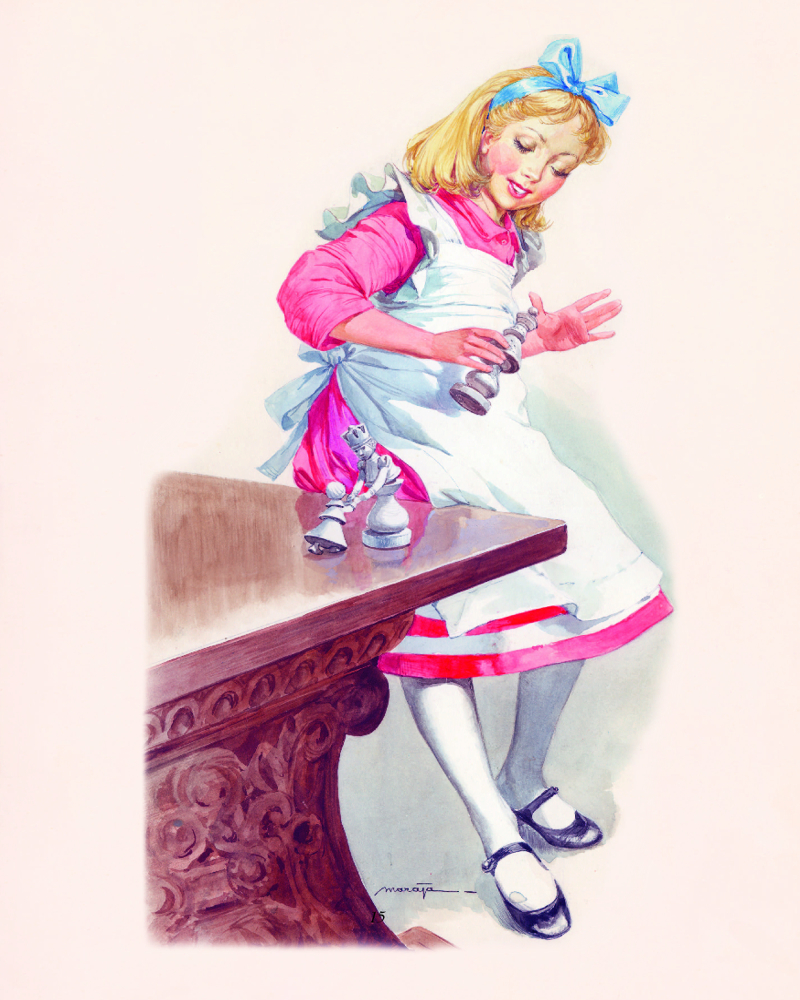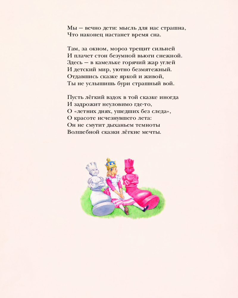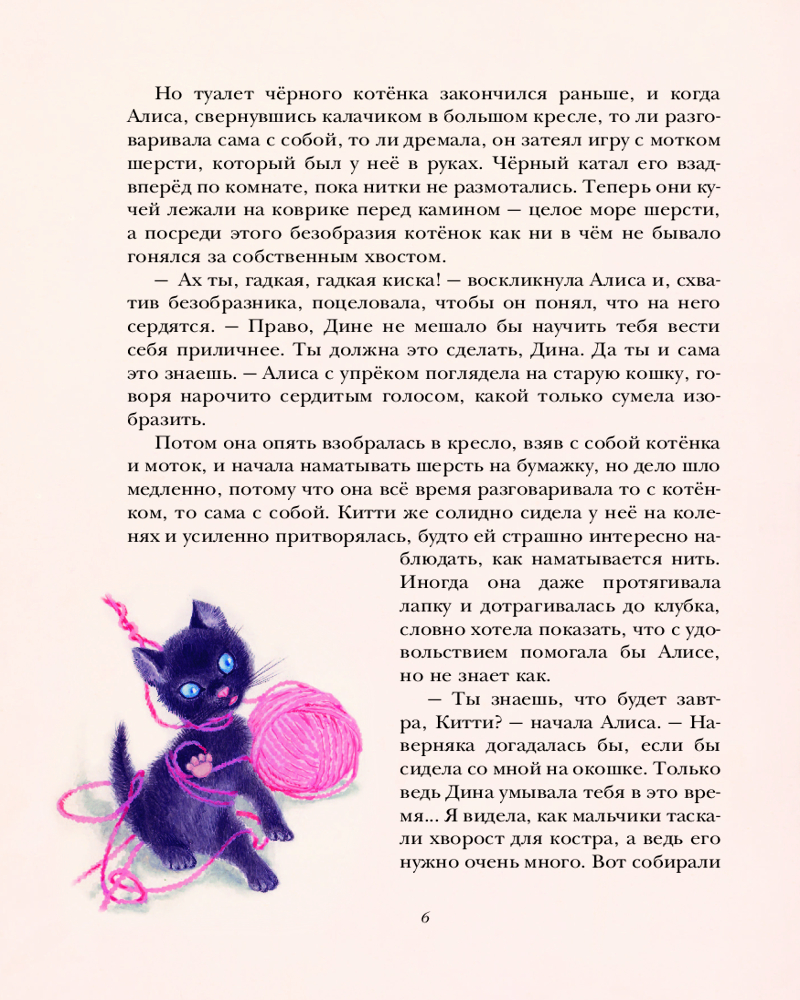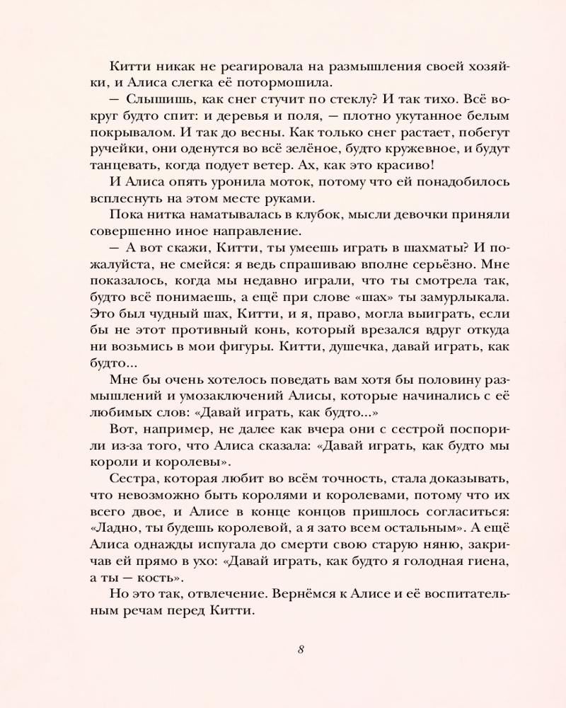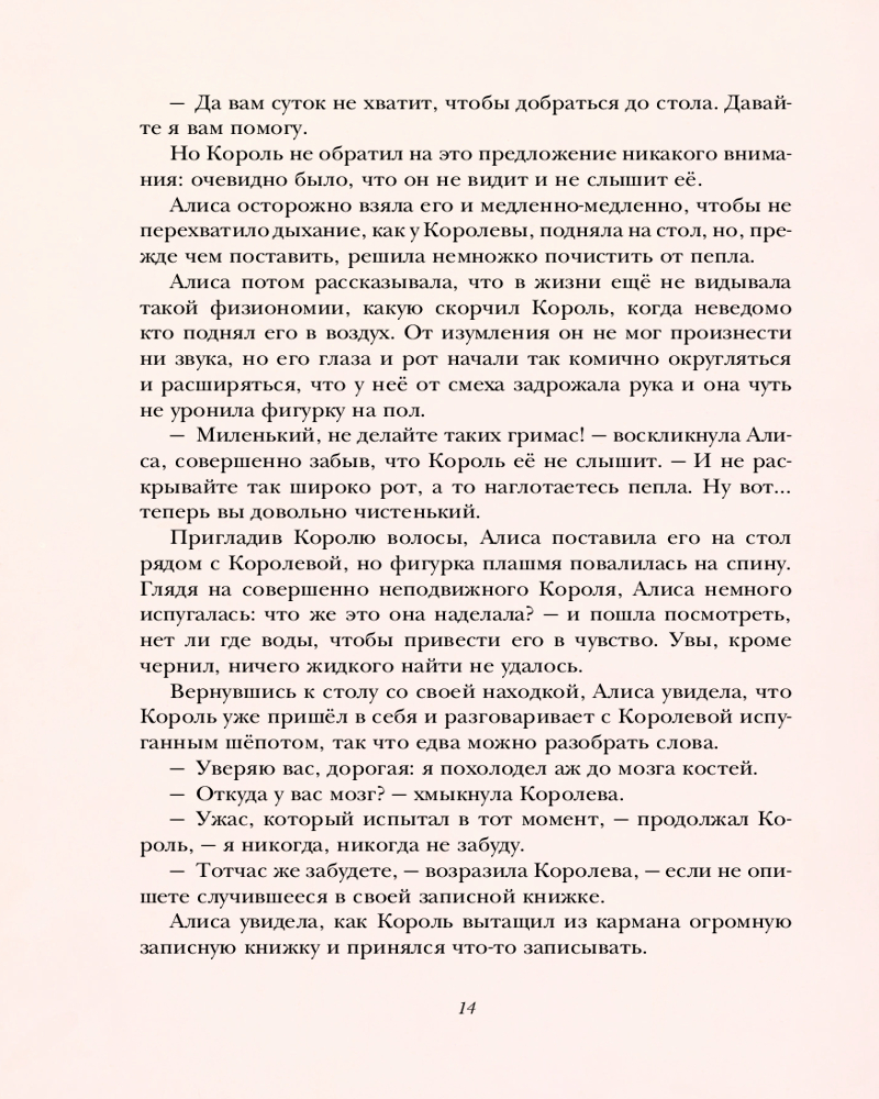 Серия: Искусство иллюстрации. Коллекция утончённых книг Неунывающая Алиса вновь попадает в волшебную страну — на этот раз в Зазеркалье. Здесь всё до странности наоборот: чтобы остаться на месте, нужно очень быстро бежать, зазеркальный пирог нужно сначала раздать гостям, а после порезать, а жители этой страны помнят только то, что произойдёт в будущем. Ещё Алисе предстоит сыграть с героями шахматную партию и стать королевой. Путешествие по необычной стране, логические загадки, несуразицы и философские размышления |