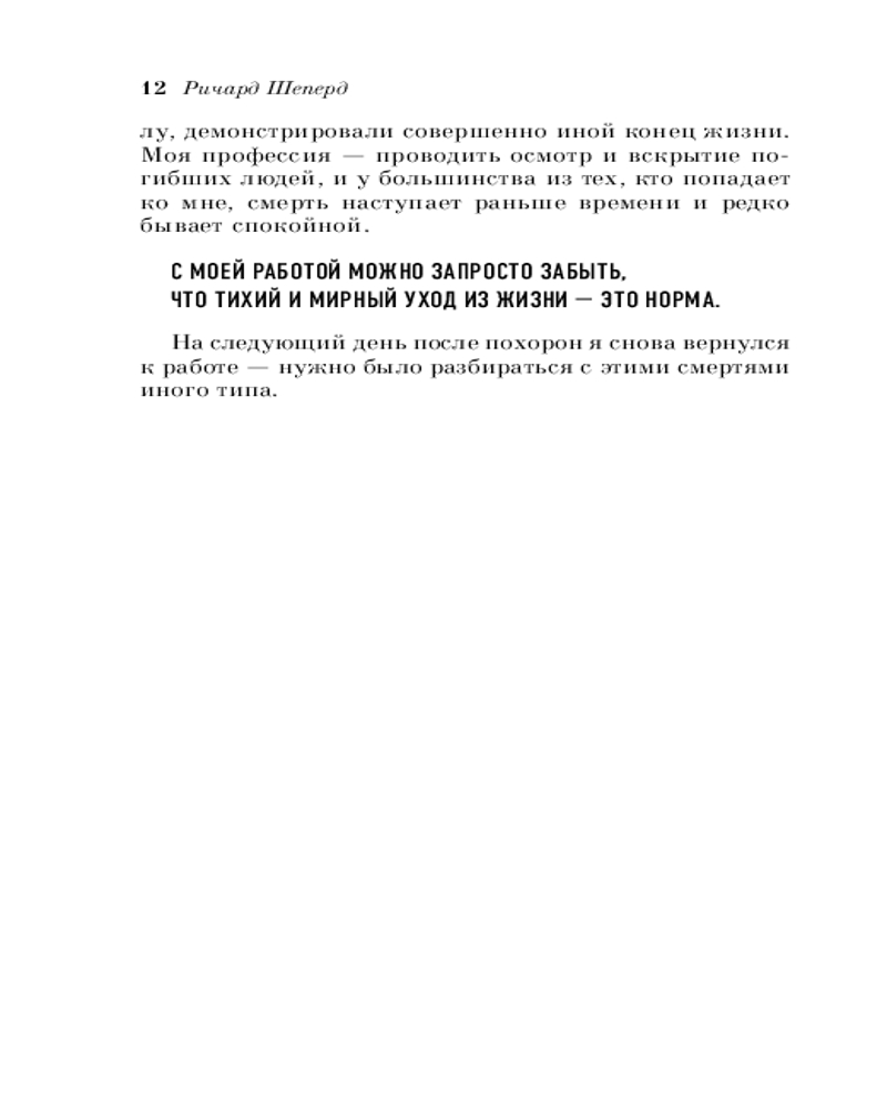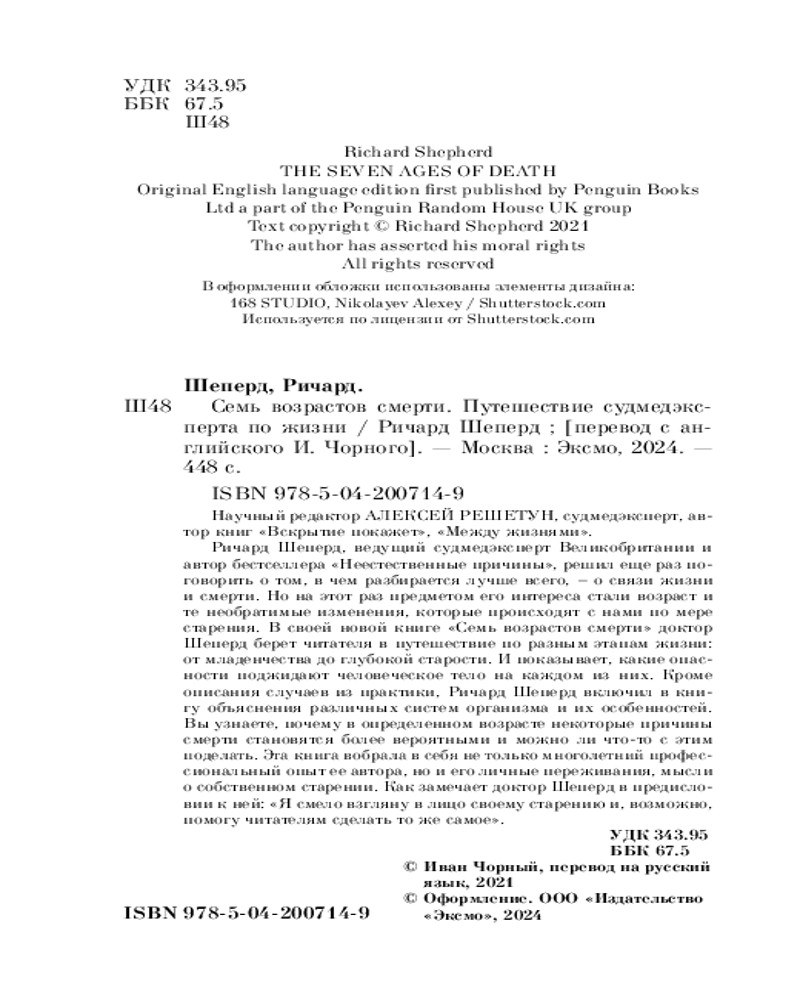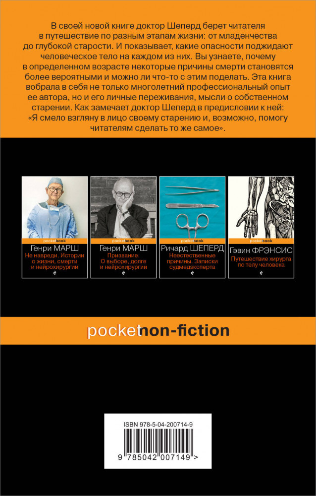 💳 Оплатить за товар можно при получении 🇰🇿 Есть бесплатная доставка по Казахстану от 1 дня 🎁 Копите бонусы с каждой покупки Серия: Pocket book (обложка). Non-fiction Научный редактор Алексей Решутин, судмедэксперт, автор книг Вскрытие покажет, Между жизнями Ричард Шеперд, ведущий судмедэксперт Великобритании и автор бестселлера «Неестественные причины», решил еще раз поговорить о том, в чем разбирается лучше всего, — о связи жизни и смерти. Но на этот раз предметом его интереса стали возраст и те необратимые изменения, которые происходят с нами по мере старения. В своей новой книге «Семь возрастов смерти» доктор Шеперд берет читателя в путешествие по разным этапам жизни: от младенчества до глубокой старости. И показывает, какие опасности поджидают человеческое тело на каждом из них. Кроме описания случаев из практики, Ричард Шеперд включил в книгу объяснения различных систем организма и их особенностей. Вы узнаете, почему в определенном возрасте некоторые причины смерти становятся более вероятными и можно ли что-то с этим поделать. Эта книга вобрала в себя не только многолетний профессиональный опыт ее автора, но и его личные переживания, мысли о собственном старении. Как замечает доктор Шеперд в предисловии к ней: «Я смело взгляну в лицо своему старению и, возможно, помогу читателям сделать то же самое». |
