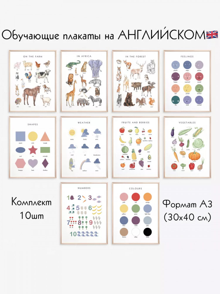 BALAMOUR Набор из 10 постеров на английском языке для детей формат А3 с ламинированием 1-3 г.+180