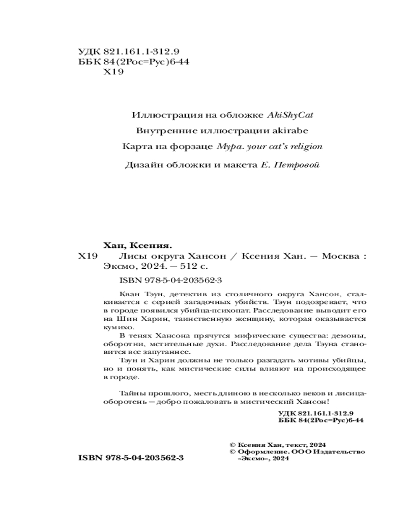 💳 Оплатить за товар можно при получении 🇰🇿 Есть бесплатная доставка по Казахстану от 1 дня 🎁 Копите бонусы с каждой покупки Серия: Охотники за мирами Кван Тэун, детектив из столичного округа Хансон, сталкивается с серией загадочных убийств. Тэун подозревает, что в городе появился убийца-психопат. Расследование выводит его на Шин Харин, таинственную женщину, которая оказывается кумихо. В тенях Хансона прячутся мифические существа: демоны, оборотни, мстительные духи. Расследование дела Тэуна становится все запутаннее. Тэун и Харин должны не только разгадать мотивы убийцы, но и понять, как мистические силы влияют на происходящее в городе. Тайны прошлого, месть длиною в несколько веков и лисица-оборотень — добро пожаловать в мистический Хансон! |