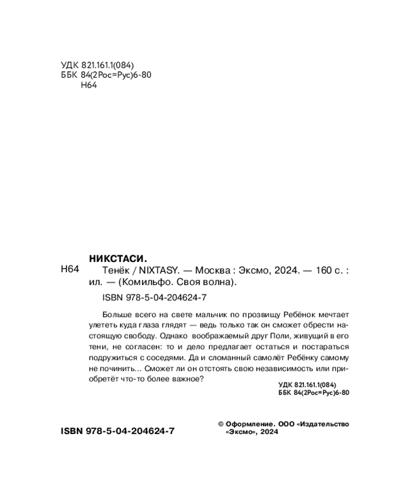 💳 Оплатить за товар можно при получении 🇰🇿 Есть бесплатная доставка по Казахстану от 1 дня 🎁 Копите бонусы с каждой покупки Серия: Комильфо. Своя волна Больше всего на свете мальчик по прозвищу Ребёнок мечтает улететь куда глаза глядят — ведь только так он сможет обрести настоящую свободу. Однако воображаемый друг Поли, живущий в его тени, не согласен: то и дело предлагает остаться и постараться подружиться с соседями. Да и сломанный самолёт Ребёнку самому не починить... Сможет ли он отстоять свою независимость, или приобретёт что-то более важное? |