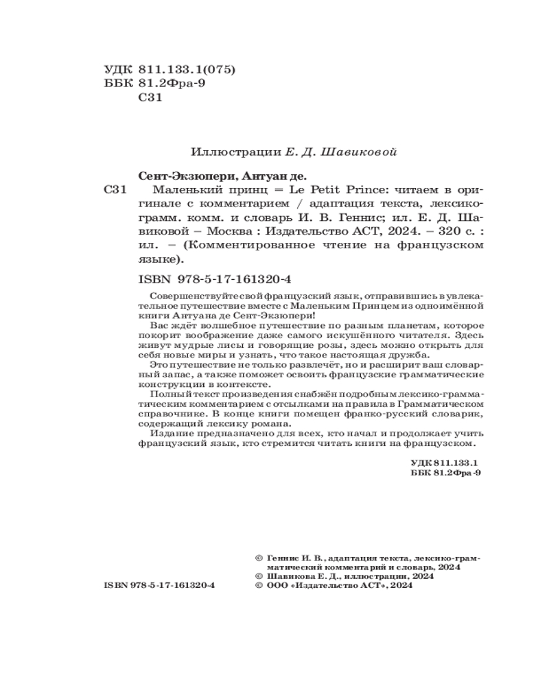 💳 Оплатить за товар можно при получении 🇰🇿 Есть бесплатная доставка по Казахстану от 1 дня 🎁 Копите бонусы с каждой покупки Серия: Комментированное чтение на французском языке Лучший способ учить иностранный язык — это читать художественное произведение, постепенно овладевая лексикой и грамматикой. Совершенствуйте свой французский язык, отправившись в увлекательное путешествие вместе с Маленьким принцем из одноимённой книги Антуана де Сент-Экзюпери! Вас ждёт волшебное путешествие по разным планетам, которое покорит воображение даже самого искушённого читателя. Здесь живут мудрые лисы и говорящие розы, здесь можно открыть для себя новые миры и узнать, что такое настоящая дружба. |