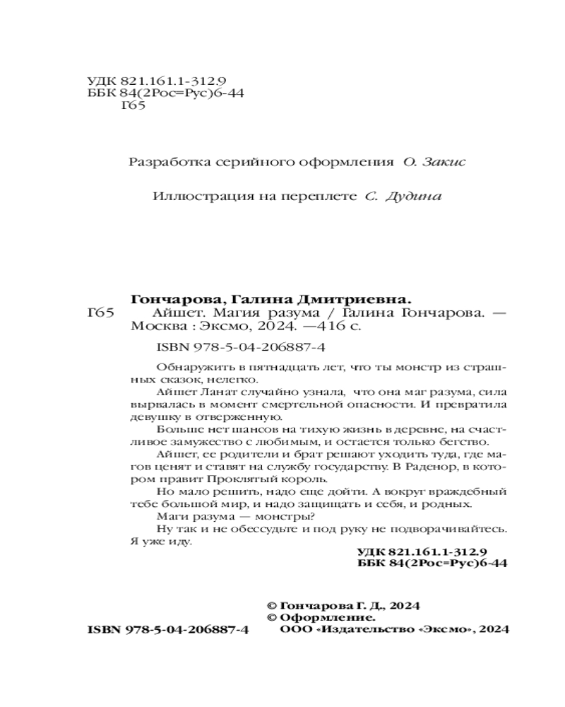 💳 Оплатить за товар можно при получении 🇰🇿 Есть бесплатная доставка по Казахстану от 1 дня 🎁 Копите бонусы с каждой покупки Серия: Колдовские миры Галины Гончаровой. Новое оформление Обнаружить в пятнадцать лет, что ты — монстр из страшных сказок, нелегко. Айшет Ланат случайно узнала, что она маг разума, сила вырвалась в момент смертельной опасности. И превратила девушку в отверженную. Больше нет шансов на тихую жизнь в деревне, на счастливое замужество с любимым, и остается только бегство. Айшет, ее родители и брат решают уходить туда, где магов ценят и ставят на службу государству. В Раденор, в котором правит Проклятый король. Но мало решить, надо еще дойти. А вокруг враждебный тебе большой мир, и надо защищать и себя, и родных. Маги разума — монстры? Ну так и не обессудьте, и под руку не подворачивайтесь. Я уже иду. |