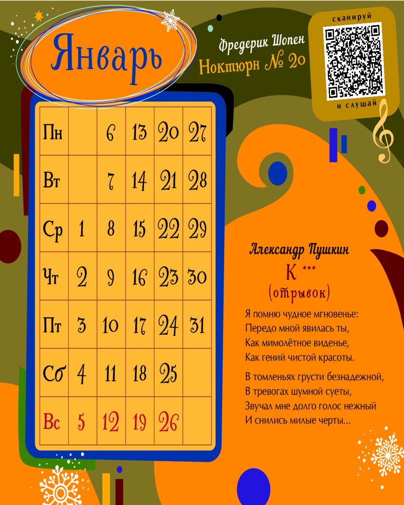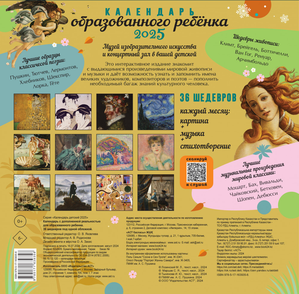 Календарь детский на 2025 год с дополненной реальностью для образованного ребёнкаВ данный момент этот товар отсутствует в продаже. Возможно, у нас найдется аналогичный или похожий товар здесь. Серия: Календарь детский 2025 Этот красочный интерактивный календарь познакомит вашего ребенка с выдающимися произведениями поэзии, живописи и музыки. Целых 36 мировых шедевров под одной обложкой! Каждый месяц его ждут картина, музыка и стихотворение. Пушкин, Тютчев, Лермонтов, Хлебников, Шекспир, Лорка, Гёте. Климт, Брейгель, Боттичелли, Ван Гог, Ренуар, Арчимбольдо, Моцарт, Бах, Вивальди, Чайковский, Бетховен, Шопен, Дебюсси... Маленький почемучка узнает оновные направления живописи от романтизма и рококо до импрессионизма и сюрреализма, запомнит имена художников, композиторов, поэтов, послушает волшебную музыку, доступную по QR-кодам, и в результате за год пополнит необходимый багаж знаний культурного человека. Для младшего школьного возраста. |