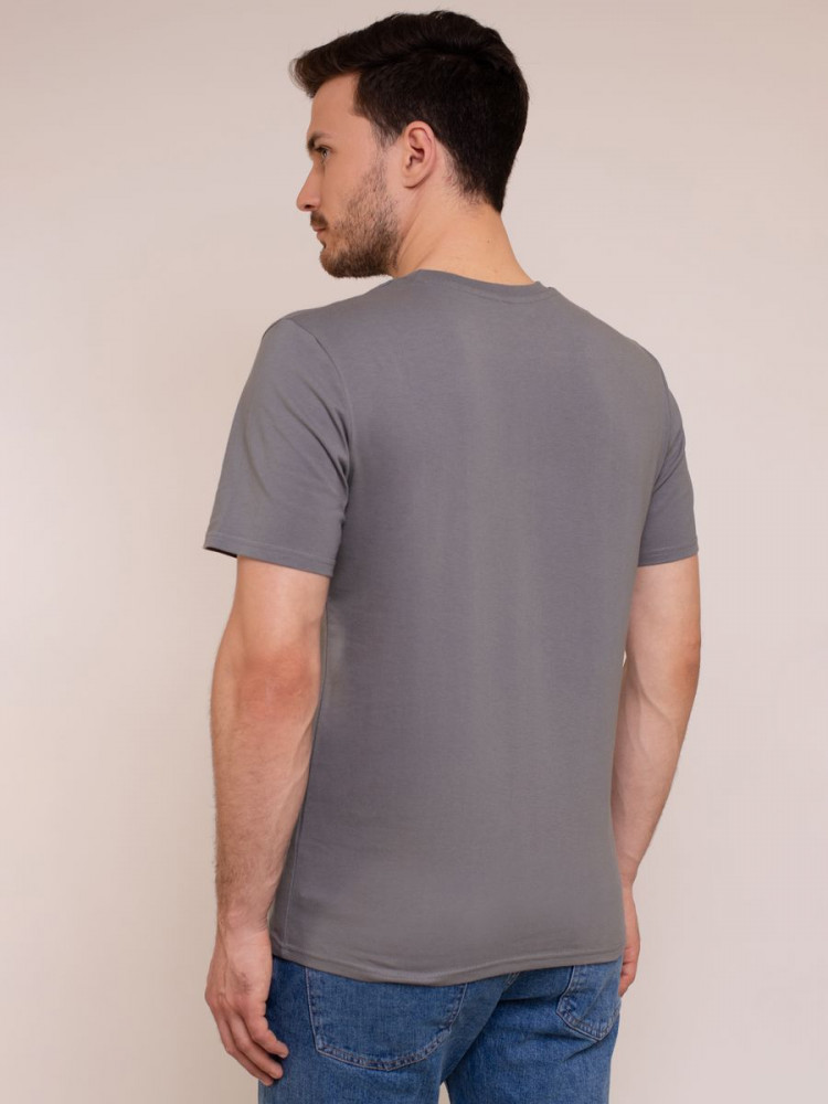 Футболка прямого покроя с втачными короткими рукавами. По линии горловины втачен ворот из ластичного полотна с 5% добавлением лайкры. Перед и спинка цельнокроеная. Плечевые швы обтачены бейкой из основного полотна, в край проложена отделочная строчка. Низ футболки и рукава подогнуты и подшиты на распошивальной машине. Ткань — кулирная гладь, из гребенной пряжи Ne 24/1, активное глубокое крашение.