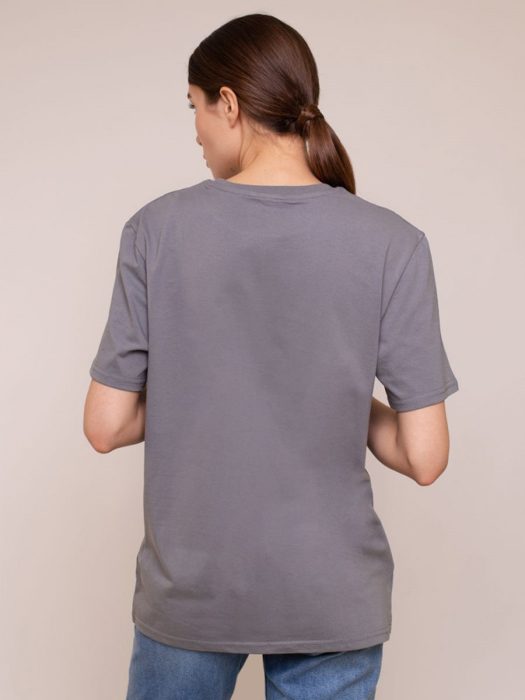 Футболка прямого покроя с втачными короткими рукавами. По линии горловины втачен ворот из ластичного полотна с 5% добавлением лайкры. Перед и спинка цельнокроеная. Плечевые швы обтачены бейкой из основного полотна, в край проложена отделочная строчка. Низ футболки и рукава подогнуты и подшиты на распошивальной машине. Ткань — кулирная гладь, из гребенной пряжи Ne 24/1, активное глубокое крашение.