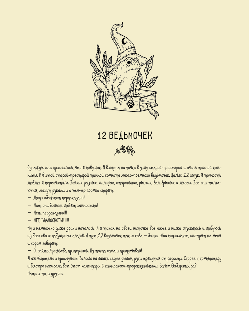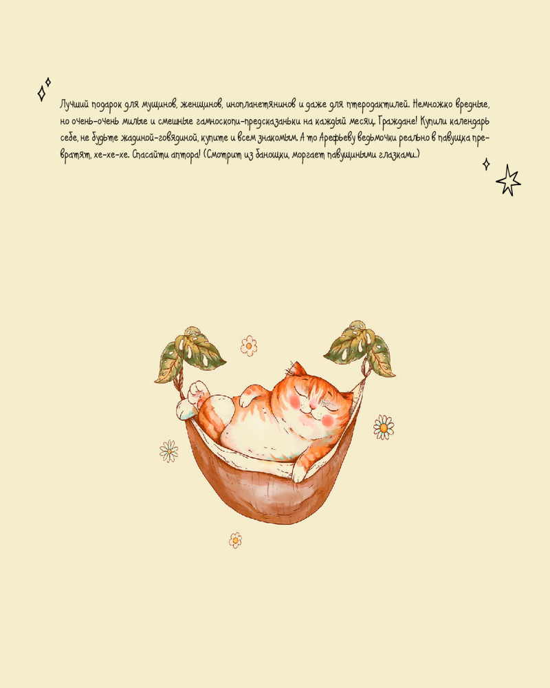 Календарь настенный на 2025 год «Магищески женщины и их котики»В данный момент этот товар отсутствует в продаже. Возможно, у нас найдется аналогичный или похожий товар здесь. Серия: Счастливый календарь Вдохновение, приди! Вдохновение, приди!.. В пробке где-то стоит, наверное, нет его и нет. А вместе с ним нет и желания что-то делать. Но тут вдруг: «Хоба!» Это вы открыли чудесный календарь от автора бестселлеров Зои Арефьевой и художницы Татьяны Придчиной. Магищески женщинов и их котики — ваш уголок волшебства, где можно зарядиться вдохновением! А предсказания на месяц от автора как чудесная палочка-выручалочка: вмиг поднимут настроение и восполнят запасы сил, чтобы вы осуществили все задуманное. Каждый из нас немножко волшебник, помните. Пыщ-пыщ! |