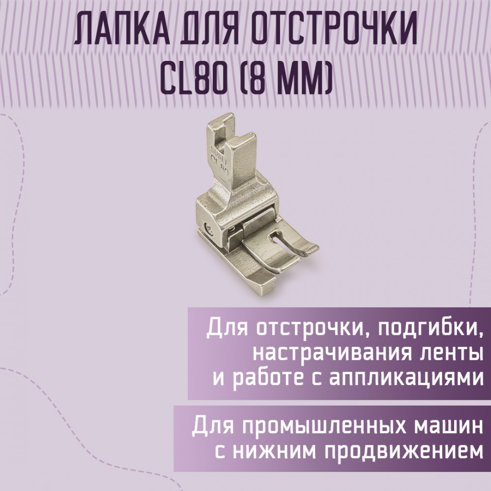 Yoke Лапка для отстрочки CL80В данный момент этот товар отсутствует в продаже. Возможно, у нас найдется аналогичный или похожий товар здесь. CL 80 — это лапка для отстрочки, отделочной строчки на 8 мм от края для промышленных машин. Лапка CL80 левосторонняя. Размер определяется от центра иглы до подпружиненной части. Применяется для работы с разными видами материалов: кожей, нубуком, трикотажными тканями, замшей, синтетической пленкой и пр. для прокладывания строчки необходимой величины и длины, а также для подгибки, потайных и краеобметочных швов, зигзагов, при настрачивания бисера, пайеток, резинки, канта, бусин, лент; при работе с различными декоративными элементами: аппликациями, молниями, пуговицами. На лапке установлен ограничитель в виде подпружиненного бортика (левый). Расстояние иглы до подпружиненной части лапки 8 мм. Ширина лапки 19 мм. |