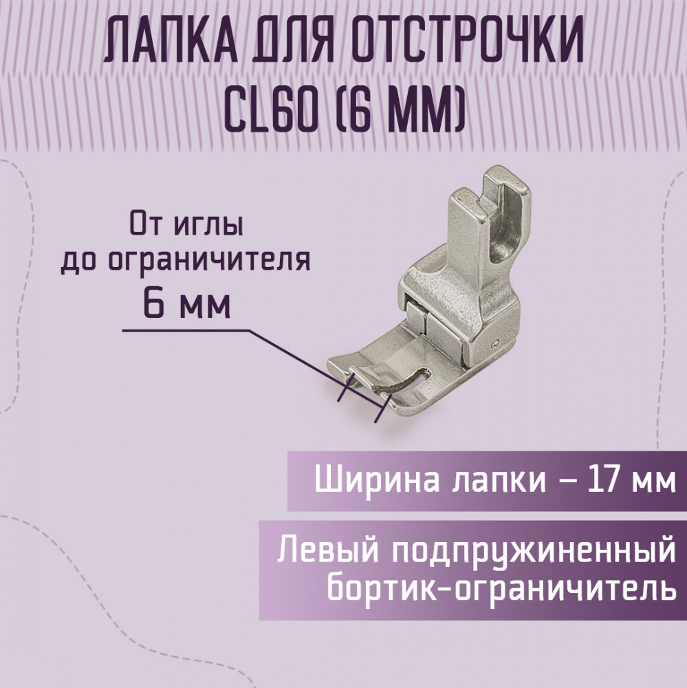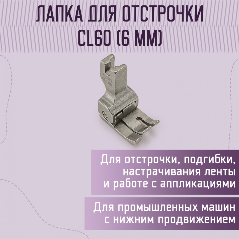 Yoke Лапка для отстрочки CL60В данный момент этот товар отсутствует в продаже. Возможно, у нас найдется аналогичный или похожий товар здесь. CL 60 — это лапка для отстрочки, отделочной строчки на 6 мм от края для промышленных машин. Лапка CL60 левосторонняя. Размер определяется от центра иглы до подпружиненной части. Применяется для работы с разными видами материалов: кожей, нубуком, трикотажными тканями, замшей, синтетической пленкой и пр. для прокладывания строчки необходимой величины и длины, а также для подгибки, потайных и краеобметочных швов, зигзагов, при настрачивания бисера, пайеток, резинки, канта, бусин, лент; при работе с различными декоративными элементами: аппликациями, молниями, пуговицами. На лапке установлен ограничитель в виде подпружиненного бортика (левый). Расстояние иглы до подпружиненной части лапки 6 мм. Ширина лапки 17 мм. |