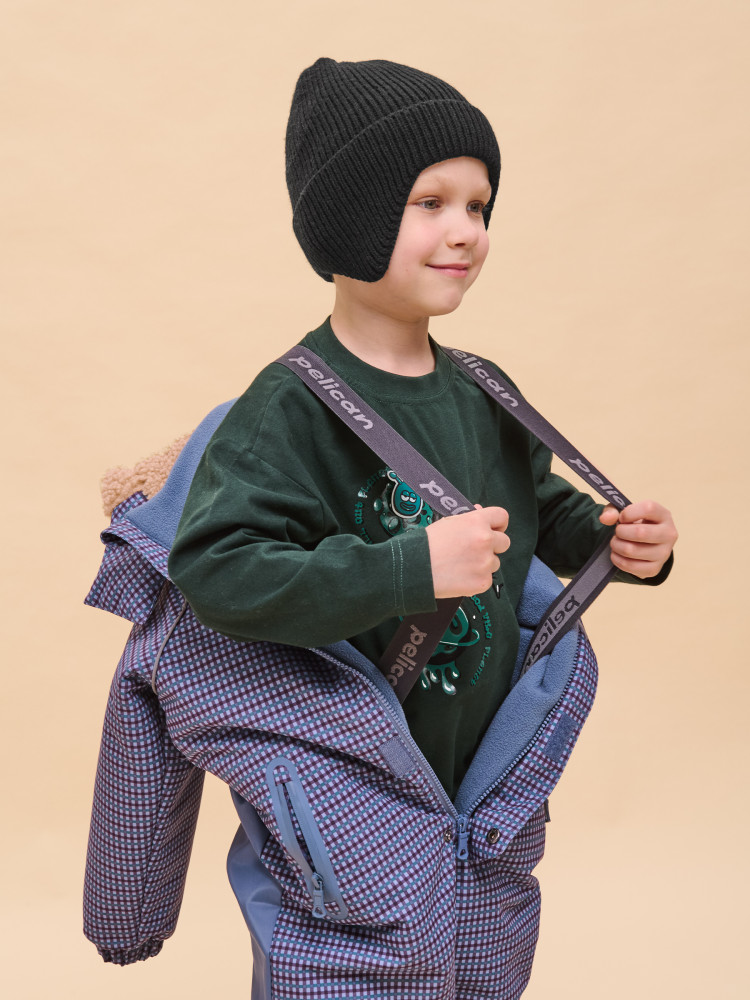 Комбинезон зимний детский из мембранной ткани. Модель свободного объёма с рукавами кроя реглан подарит ребёнку комфорт и не будет стеснять его движений. На внешнюю поверхность материала нанесена водоотталкивающая пропитка (DWR), она задерживает грязь и влагу снаружи — ребёнок не промокнет. Также есть дополнительная пропитка на внутренней стороне ткани. Капюшон двухшовный, что обеспечивает анатомически правильную форму и комфортную посадку по голове. Капюшон не отстегивается, предусмотрена регулировка объема эластичными шнурами с пластиковыми стопперами. Центральная застёжка на тракторную молнию с двумя пуллерами. Тканевый стоппер защищает подбородок от зажима молнией. Фиксирующая строчка предохраняет планку от «заедания» в процессе застёгивания. Комбинезон тёплый — дополнительно, для защиты от ветра и холода, центральная молния закрыта ветрозащитной планкой на кнопках и липучках (велкро). Спинка по талии присборена на внутреннюю резинку — комбинезон для мальчика безупречно садится по фигуре и не выглядит мешковато. Внутри комбинезона эластичные принтованные лямки — есть возможность снимать только верхнюю часть в помещении. Карманы с боковым входом закрываются на водонепроницаемую молнию со скрытыми звеньями — содержимое карманов не промокнет.