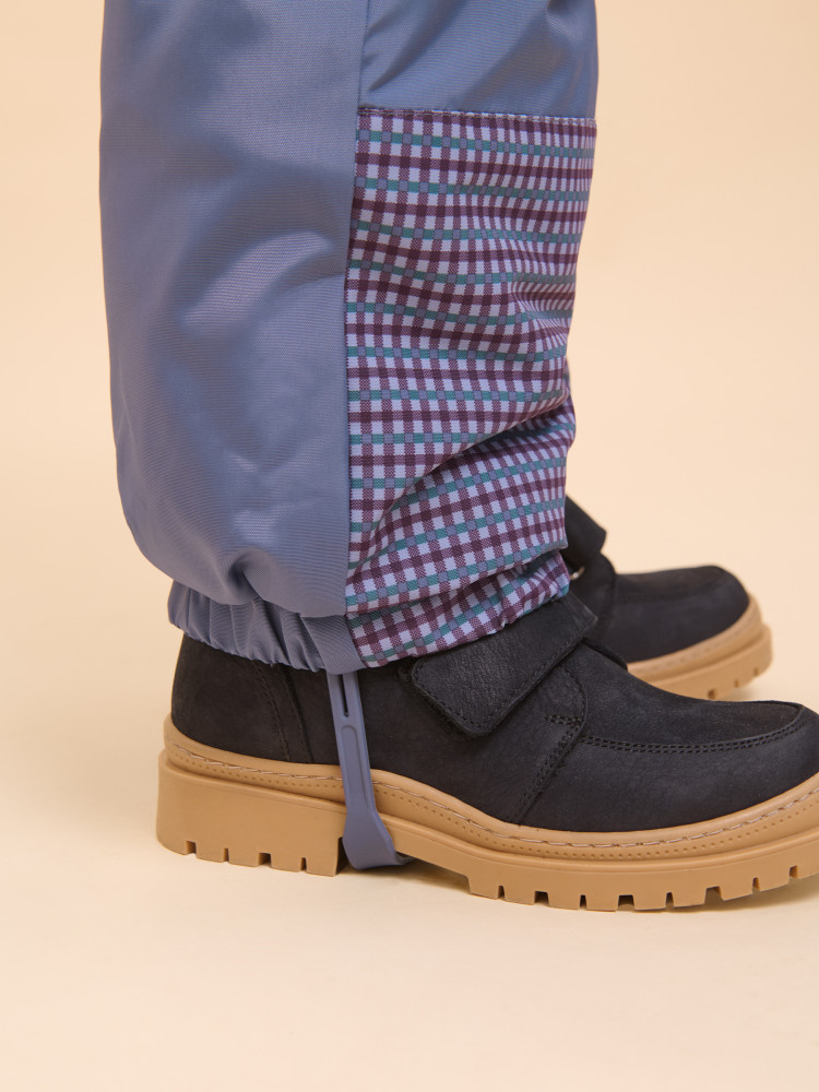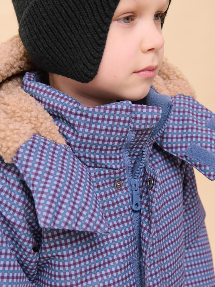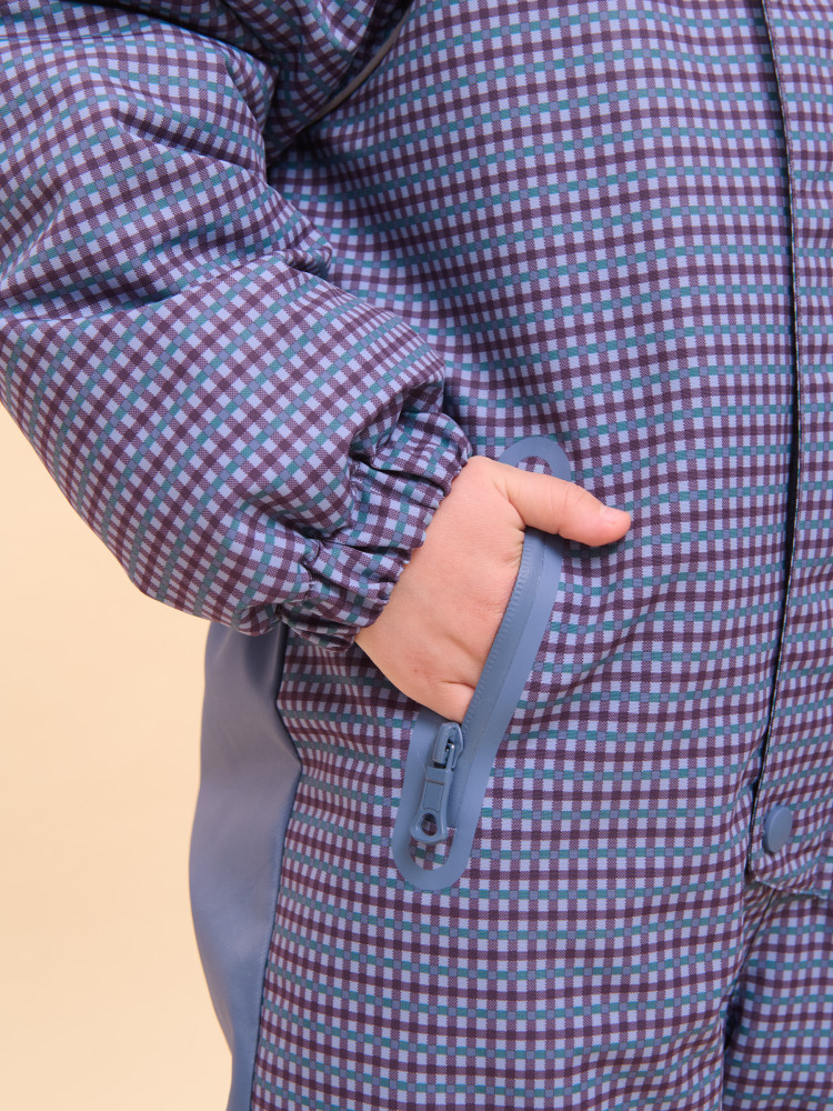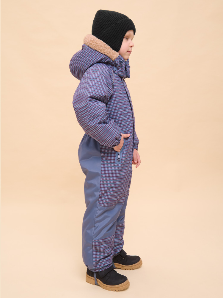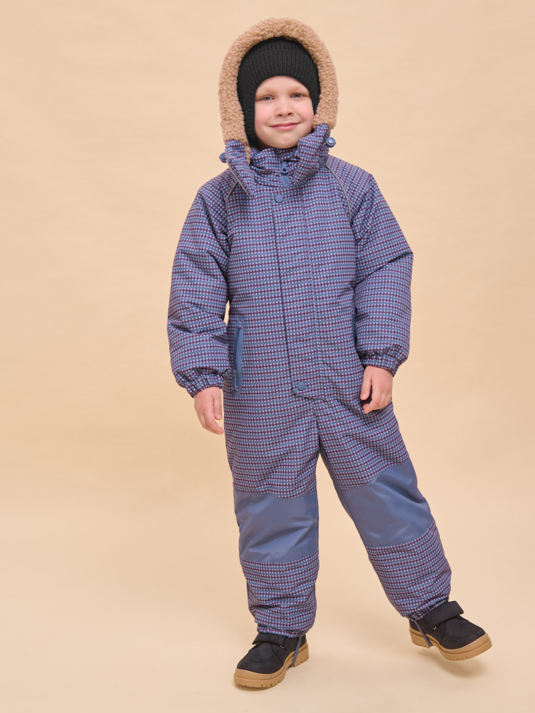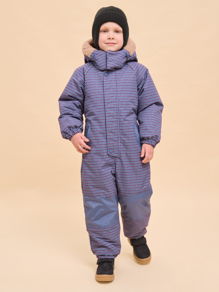 Комбинезон зимний детский из мембранной ткани. Модель свободного объёма с рукавами кроя реглан подарит ребёнку комфорт и не будет стеснять его движений. На внешнюю поверхность материала нанесена водоотталкивающая пропитка (DWR), она задерживает грязь и влагу снаружи — ребёнок не промокнет. Также есть дополнительная пропитка на внутренней стороне ткани. Капюшон двухшовный, что обеспечивает анатомически правильную форму и комфортную посадку по голове. Капюшон не отстегивается, предусмотрена регулировка объема эластичными шнурами с пластиковыми стопперами. Центральная застёжка на тракторную молнию с двумя пуллерами. Тканевый стоппер защищает подбородок от зажима молнией. Фиксирующая строчка предохраняет планку от «заедания» в процессе застёгивания. Комбинезон тёплый — дополнительно, для защиты от ветра и холода, центральная молния закрыта ветрозащитной планкой на кнопках и липучках (велкро). Спинка по талии присборена на внутреннюю резинку — комбинезон для мальчика безупречно садится по фигуре и не выглядит мешковато. Внутри комбинезона эластичные принтованные лямки — есть возможность снимать только верхнюю часть в помещении. Карманы с боковым входом закрываются на водонепроницаемую молнию со скрытыми звеньями — содержимое карманов не промокнет.