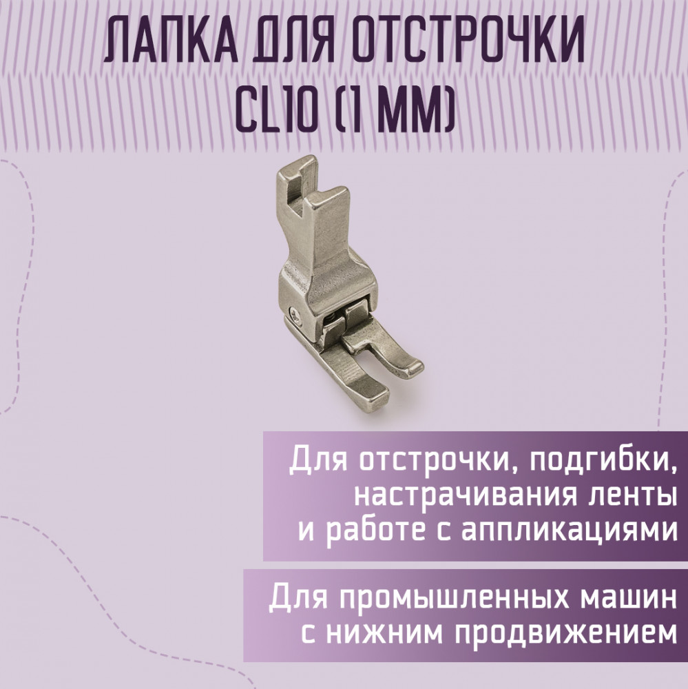 Yoke Лапка для отстрочки CL10 (1 мм)В данный момент этот товар отсутствует в продаже. Возможно, у нас найдется аналогичный или похожий товар здесь. CL 10 - это лапка для отстрочки, отделочной строчки на 1 мм от края для промышленных машин. Лапка CL10 левосторонняя. Размер определяется от центра иглы до подпружиненной части. Применяется для работы с разными видами материалов: кожей, нубуком, трикотажными тканями, замшей, синтетической пленкой и пр. для прокладывании строчки необходимой величины и длины, а также для подгибки, потайных и краеобметочных швов, зигзагов, при настрачивания бисера, пайеток, резинки, канта, бусин, лент; при работе с различными декоративными элементами: аппликациями, молниями, пуговицами. На лапке установлен ограничитель, в виде подпружиненного бортика (левый). Расстояние иглы до подпружиненной части лапки 1 мм. Ширина лапки 11 мм. |