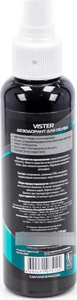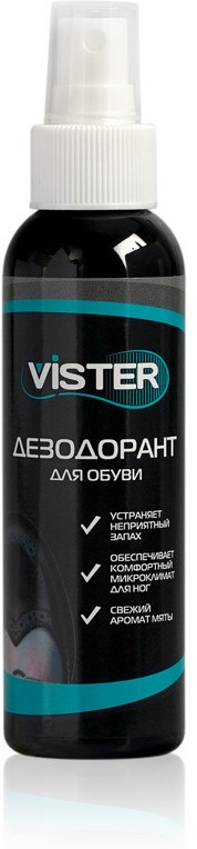 Дезодорант для обуви от запаха Vister эффективно устраняет неприятный запах, обладает дезодорирующими и антисептическими свойствами, снижает потоотделение, обеспечивает приятный запах на весь день подходит для всех видов обуви. Для обуви дезодорант Vister действует как антибактериальное средство. Он поглощает те микроорганизмы, которые и являются причинами появления запаха. Простой и удобный в использовании. Средство высыхает очень быстро и не оставляет следов.