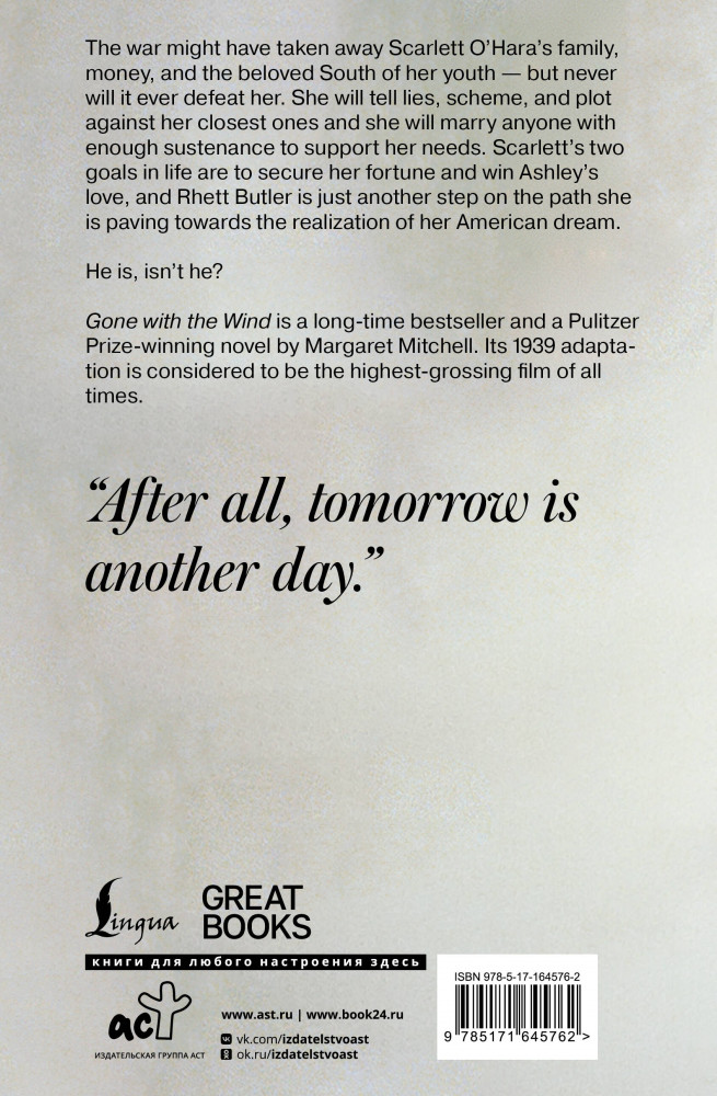 В данный момент этот товар отсутствует в продаже. Возможно, у нас найдется аналогичный или похожий товар здесь. Серия: Great Books Война забрала у Скарлетт семью, деньги и возлюбленный Юг ее юности — но сломить ее? Нет, этого не случится. Скарлетт будет врать, мошенничать, и плести интриги против самых близких, она наймет заключенных вместо рабов и выйдет замуж за любого, чьих средств хватит, чтобы обеспечивать ее и ее амбиции. Скарлетт преследует только две цели: любовь Эшли и богатство. И Ретт Батлер — лишь ступенька на пути к исполнению ее американской мечты. Ведь так? «Унесённые ветром» — роман-бестселлер, который принес Маргарет Митчелл мировую славу и Пулитцеровскую премию. Книга легла в основу одноимённого фильма 1937 года, признанного самым кассовым в истории кинематографа. |