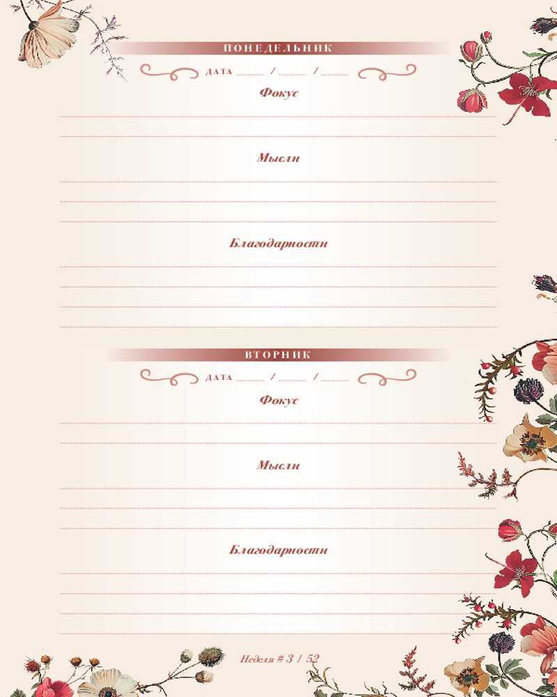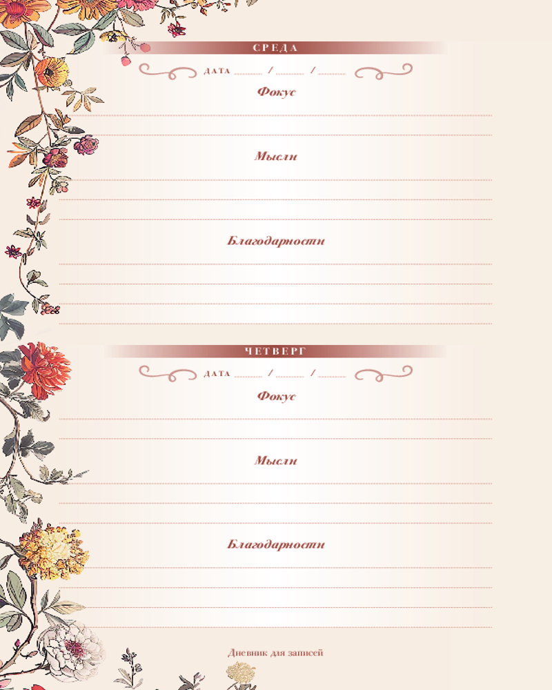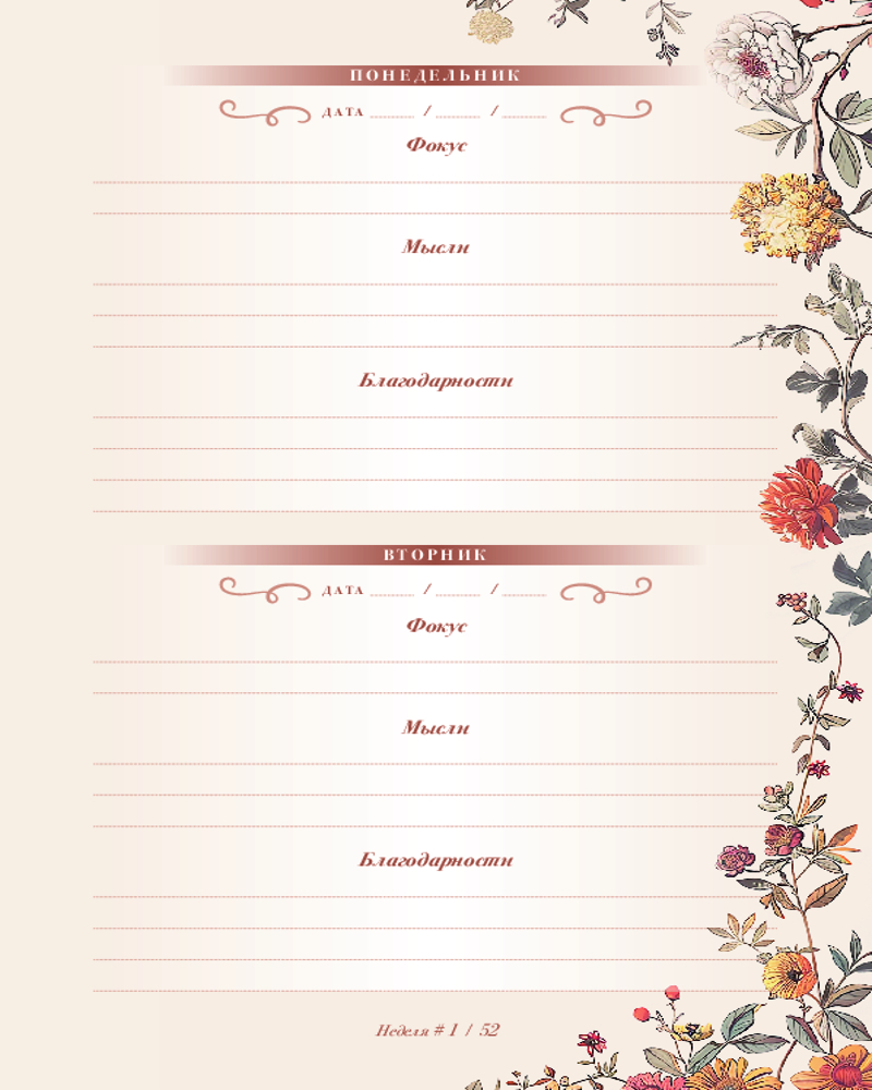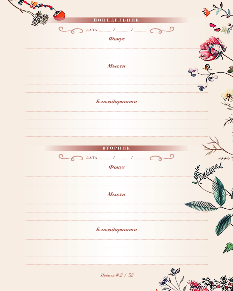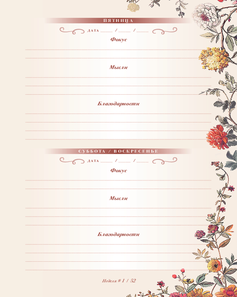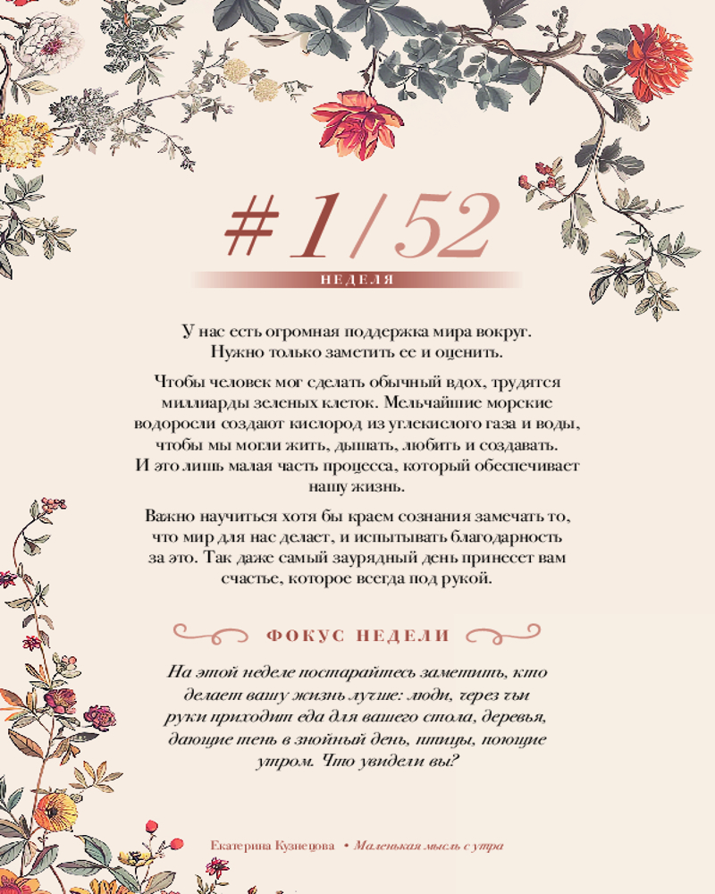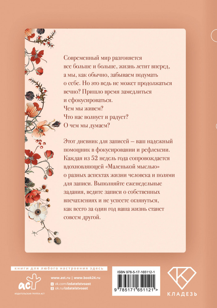 💳 Оплатить за товар можно при получении 🇰🇿 Есть бесплатная доставка по Казахстану от 1 дня 🎁 Копите бонусы с каждой покупки Серия: Quick book Современный мир разгоняется все больше и больше, жизнь летит вперед, а мы, как обычно, забываем подумать о себе. Но это ведь не может продолжаться вечно? Пришло время замедлиться и сфокусироваться. Чем мы живем? Что нас волнует и радует? О чем мы думаем? Этот дневник для записей — ваш надежный помощник в фокусировании и рефлексии. Каждая из 52 недель года сопровождается вдохновляющей «Маленькой мыслью» о разных аспектах жизни человека и полями для записи, разделенными на фокус, мысли и благодарность дня. Выполняйте еженедельные задания, ведите записи о собственных впечатлениях и не успеете оглянуться, как всего за один год ваша жизнь станет совсем другой. |