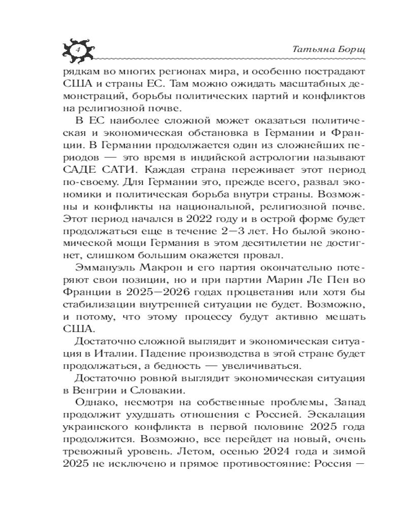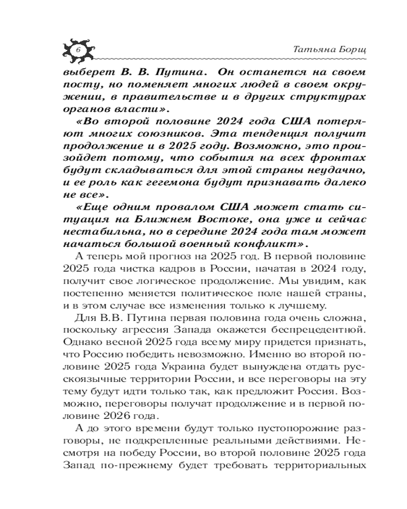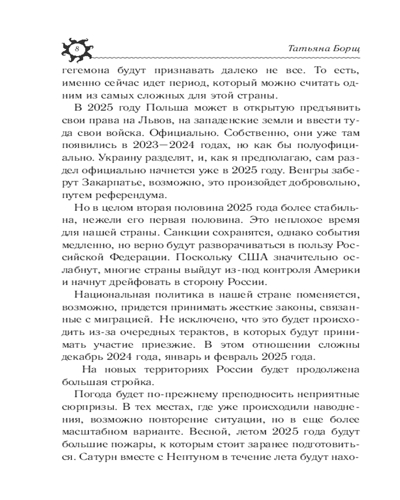 Татьяна Борщ — один из ведущих астрологов России. С 1992 года она профессионально занимается астрологической практикой, является основателем первого профессионального астрологического центра и учредителем первой астрологической газеты в Республике Кыргызстан.