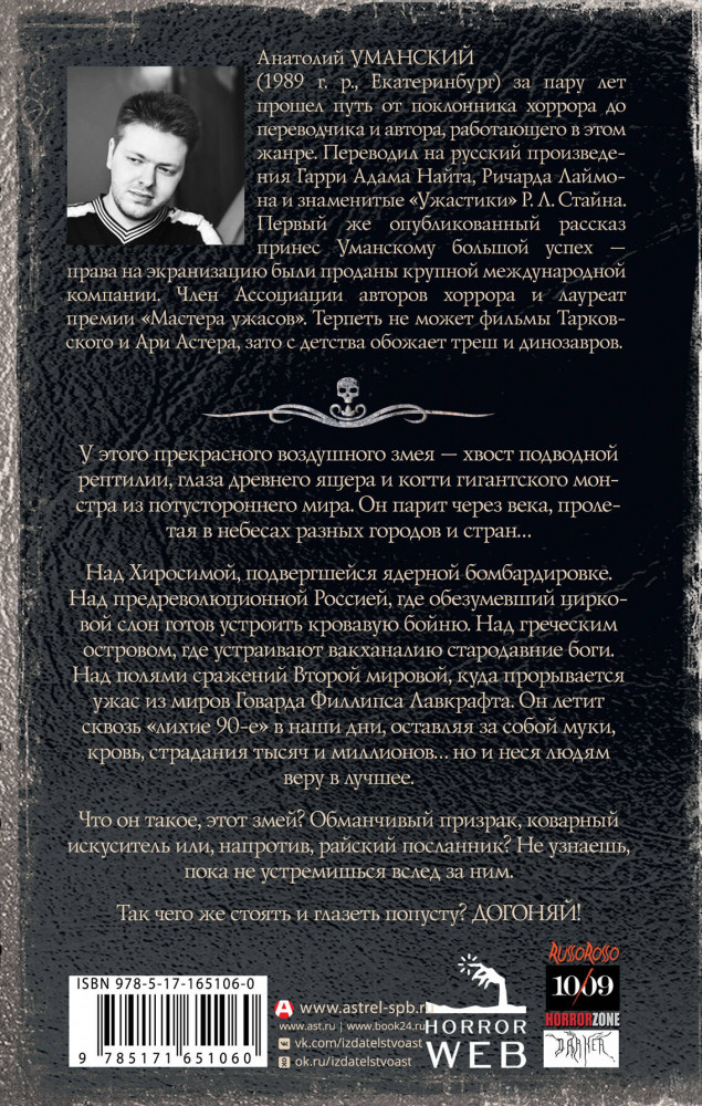 💳 Оплатить за товар можно при получении 🇰🇿 Есть бесплатная доставка по Казахстану от 1 дня 🎁 Копите бонусы с каждой покупки Серия: Самая страшная книга У этого прекрасного воздушного змея — хвост подводной рептилии, глаза древнего ящера и когти гигантского монстра из потустороннего мира. Он парит через века, пролетая в небесах разных городов и стран... Над Хиросимой, подвергшейся ядерной бомбардировке. Над предреволюционной Россией, где обезумевший цирковой слон готов устроить кровавую бойню. Над греческим островом, где устраивают вакханалию стародавние боги. Над полями сражений Второй мировой, куда прорывается ужас из миров Говарда Филлипса Лавкрафта. Он летит сквозь «лихие девяностые» в наши дни, оставляя за собой муки, кровь, страдания тысяч и миллионов... но и неся людям веру в лучшее. Что он такое, этот змей? Обманчивый призрак, коварный искуситель или, напротив, райский посланник? Не узнаешь, пока не устремишься вслед за ним. Так чего же стоять и глазеть попусту? Догоняй! |
