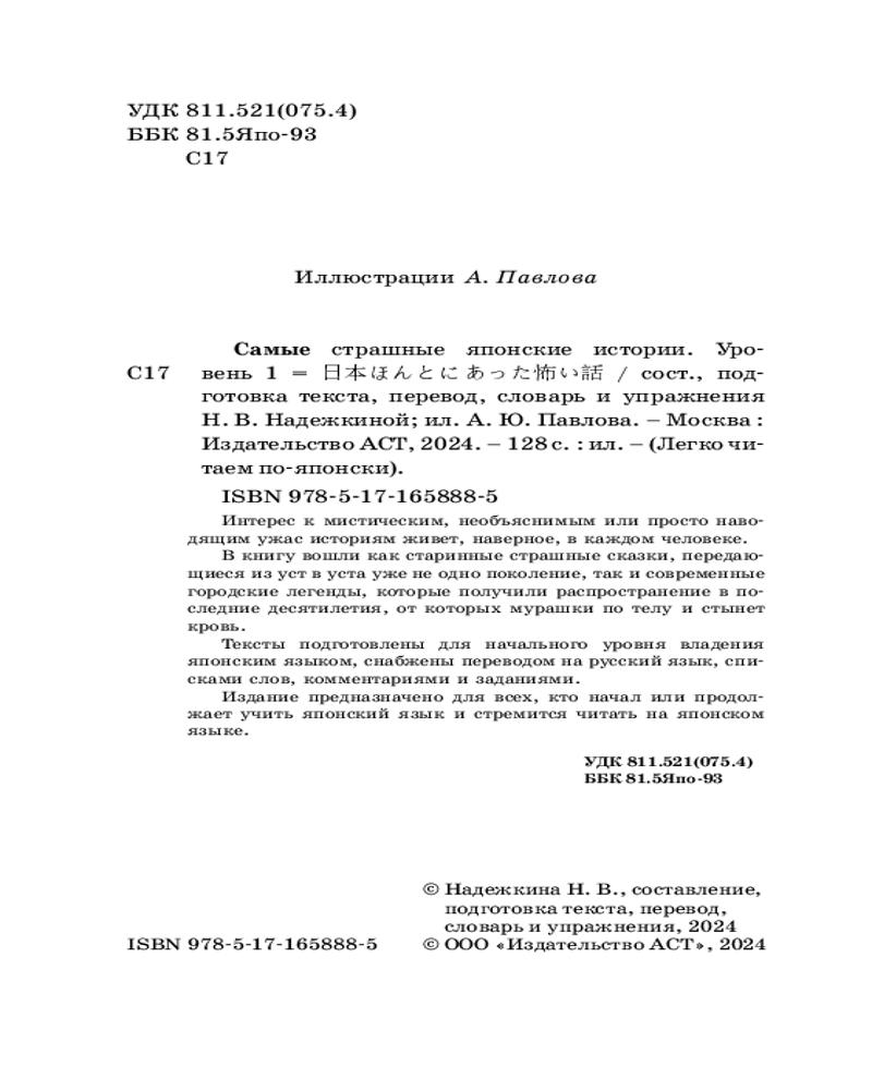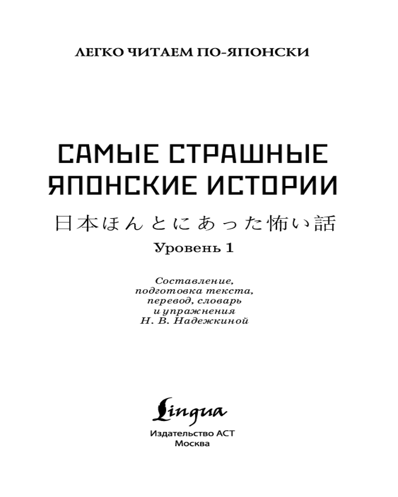 Самые страшные японские истории. Уровень 1. Nihon honto ni atta kowai hanashiВ данный момент этот товар отсутствует в продаже. Возможно, у нас найдется аналогичный или похожий товар здесь. Серия: Легко читаем по-японски Интерес к мистическим, необъяснимым или просто наводящим ужас историям живет, наверное, в каждом человеке. В эту книгу вошли как старинные страшные сказки, передающиеся из уст в уста уже не одно поколение, так и современные городские легенды, которые получили распространение в последние десятилетия, от которых мурашки по телу и стынет кровь. Тексты подготовлены для начального уровня владения японским языком, снабжены переводом на русский язык, списками слов, комментариями и заданиями. Издание предназначено для всех, кто начал или продолжает учить японский язык. |